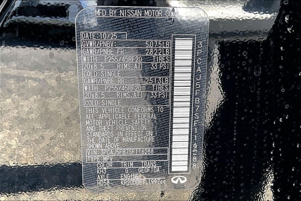 Grubbs INFINITI of San Antonio The only Authorized INFINITI Dealer in San Antonio with the largest New and Pre-Owned INFINITI Selection in the area. This 2025 INFINITI QX50 SPORT comes with 3 Year INFINITI Recommended Maintenance Included at no charge and is loaded with the following Factory Options: 12 Speakers, 4-Wheel Disc Brakes, ABS brakes, Air Conditioning, Alloy wheels, AM/FM radio: SiriusXM, Auto High-beam Headlights, Auto-dimming Rear-View mirror, Automatic temperature control, Bose Premium Audio System, Brake assist, Bumpers: body-color, CD player, Climate Controlled Front Bucket Seats, Delay-off headlights, Driver door bin, Driver vanity mirror, Dual front impact airbags, Dual front side impact airbags, Electronic Stability Control, Emergency communication system: INFINITI InTouch (1-year complimentary trial), Exterior Parking Camera Rear, Four wheel independent suspension, Front anti-roll bar, Front Bucket Seats, Front Center Armrest, Front dual zone A/C, Front fog lights, Front reading lights, Fully automatic headlights, Garage door transmitter: HomeLink, Heated door mirrors, Heated front seats, Heated steering wheel, Illuminated entry, Illuminated Kick Plates, Knee airbag, Leather Shift Knob, Leather steering wheel, Low tire pressure warning, Memory seat, Navigation system: INFINITI InTouch Navigation, Occupant sensing airbag, Outside temperature display, Overhead airbag, Overhead console, Panic alarm, Passenger door bin, Passenger vanity mirror, Power door mirrors, Power driver seat, Power Liftgate, Power moonroof, Power passenger seat, Power steering, Power windows, Radio data system, Rear anti-roll bar, Rear reading lights, Rear seat center armrest, Rear side impact airbag, Rear window defroster, Rear window wiper, Remote keyless entry, Security system, Semi-Aniline Leather-Appointed Seat Trim, Speed control, Speed-sensing steering, Speed-Sensitive Wipers, Splash Guards (Set of 4), Split folding rear seat, Spoiler, Steering wheel mounted audio controls, Tachometer, Telescoping steering wheel, Tilt steering wheel, Traction control, Trip computer, Turn signal indicator mirrors, Variably intermittent wipers, Ventilated front seats, and Wheels: 20 Dark-Painted Machine-Finished Alloy!! Priced below KBB Fair Purchase Price!