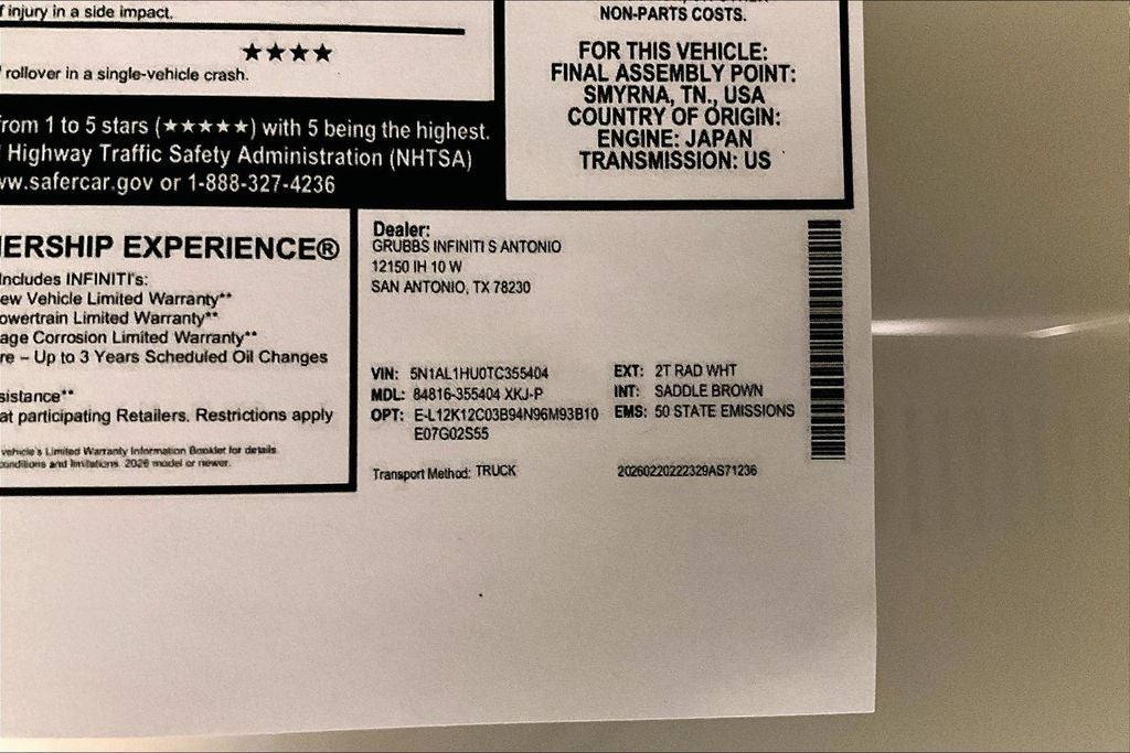 Grubbs INFINITI of San Antonio The only Authorized INFINITI Dealer in San Antonio with the largest New and Pre-Owned INFINITI Selection in the area. This 2026 INFINITI QX60 Autograph comes with 3 Year INFINITI Recommended Maintenance Included at no charge and is loaded with the following Factory Options: Dark Cargo Package (Black Rear Bumper Film, Cargo Blocks, Cargo Mat, Cargo Net, and Medic Kit), 2-Tone Super Premium Paint, 20 Speakers, 3rd row seats: bench, 4-Wheel Disc Brakes, ABS brakes, Air Conditioning, Alloy wheels, AM/FM radio: SiriusXM with 360L, Anti-whiplash front head restraints, Apple CarPlay/Android Auto, Auto High-beam Headlights, Auto tilt-away steering wheel, Auto-dimming door mirrors, Auto-dimming Rear-View mirror, Automatic temperature control, Black Roof Rail Crossbars, Bose Performance Series 17-Speaker Sound System, Brake assist, Bumpers: body-color, Climate Controlled Massaging Front Bucket Seats, Delay-off headlights, Driver door bin, Driver vanity mirror, Dual front impact airbags, Dual front side impact airbags, Electronic Stability Control, Emergency communication system: INFINITI InTouch, Four wheel independent suspension, Front anti-roll bar, Front Bucket Seats, Front Center Armrest, Front dual zone A/C, Front reading lights, Fully automatic headlights, Garage door transmitter: HomeLink, Genuine wood door panel insert, Heads-Up Display, Heated door mirrors, Heated front seats, Heated rear seats, Heated steering wheel, Illuminated entry, INFINITI Radiant Dark Illuminated Cargo Scuff Plates, Knee airbag, Leather Shift Knob, Leather steering wheel, Low tire pressure warning, Memory seat, Navigation system: Google Built-in, Occupant sensing airbag, Outside temperature display, Overhead airbag, Overhead console, Panic alarm, Passenger door bin, Passenger vanity mirror, Power door mirrors, Power driver seat, Power Liftgate, Power moonroof: Panoramic, Power passenger seat, Power steering, Power windows, Radio data system, Radio: Klipsch Premiere Audio System, Rain sensing wipers, Rear air conditioning, Rear anti-roll bar, Rear reading lights, Rear side impact airbag, Rear window defroster, Rear window wiper, Reclining 3rd row seat, Remote keyless entry, Security system, Semi Aniline Leather-Appointed Seating Surfaces, Speed control, Speed-sensing steering, Speed-Sensitive Wipers, Splash Guards, Split folding rear seat, Spoiler, Steering wheel memory, Steering wheel mounted audio controls, Tachometer, Telescoping steering wheel, Tilt steering wheel, Traction control, Trip computer, Turn signal indicator mirrors, Variably intermittent wipers, Ventilated front seats, and Wheels: 20 x 8J Luxury Machined Aluminum Alloy!! Priced below KBB Fair Purchase Price!