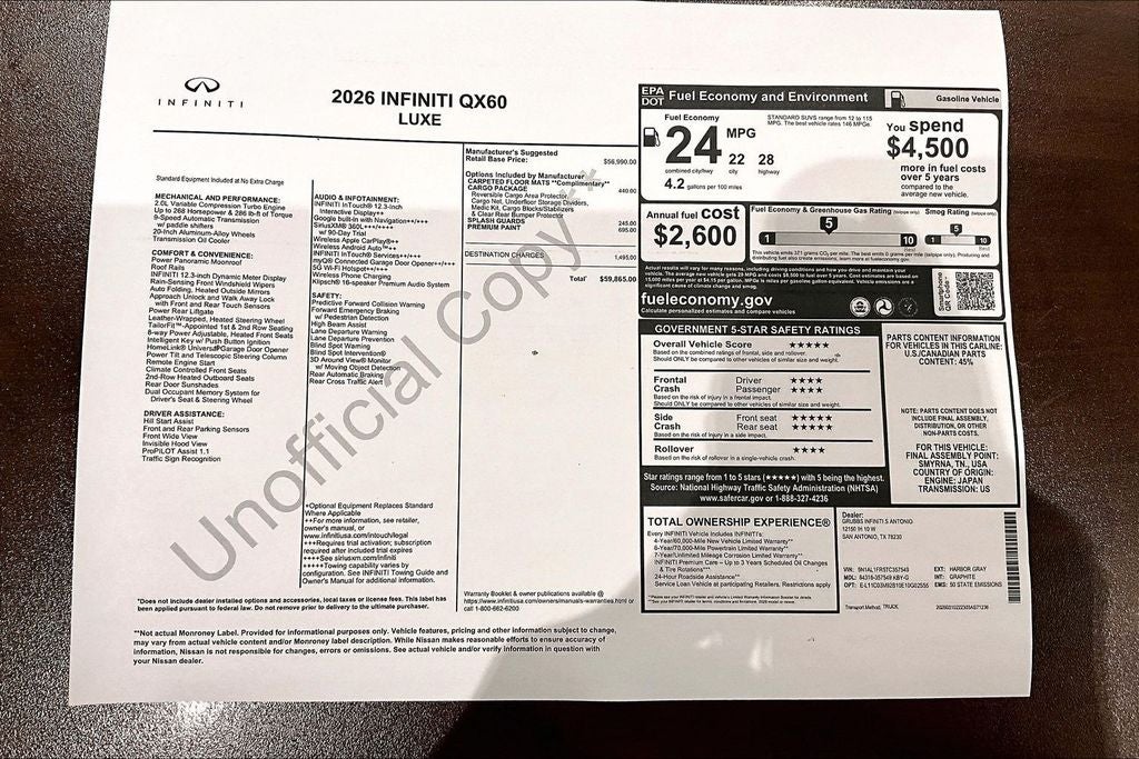 Grubbs INFINITI of San Antonio The only Authorized INFINITI Dealer in San Antonio with the largest New and Pre-Owned INFINITI Selection in the area. This 2026 INFINITI QX60 LUXE comes with 3 Year INFINITI Recommended Maintenance Included at no charge and is loaded with the following Factory Options: Cargo Package (Cargo Blocks, Cargo Mat, Cargo Net, Clear Rear Bumper Film, and Medic Kit), 16 Speakers, 3rd row seats: bench, 4-Wheel Disc Brakes, ABS brakes, Air Conditioning, Alloy wheels, AM/FM radio: SiriusXM with 360L, Anti-whiplash front head restraints, Apple CarPlay/Android Auto, Auto High-beam Headlights, Auto tilt-away steering wheel, Auto-dimming door mirrors, Auto-dimming Rear-View mirror, Automatic temperature control, Bose Performance Series 17-Speaker Sound System, Brake assist, Bumpers: body-color, Climate Controlled Front Bucket Seats, Delay-off headlights, Driver door bin, Driver vanity mirror, Dual front impact airbags, Dual front side impact airbags, Electronic Stability Control, Emergency communication system: INFINITI InTouch, Four wheel independent suspension, Front anti-roll bar, Front Bucket Seats, Front Center Armrest, Front dual zone A/C, Front reading lights, Fully automatic headlights, Garage door transmitter: HomeLink, Heated door mirrors, Heated front seats, Heated rear seats, Heated steering wheel, Illuminated entry, Knee airbag, Leather Shift Knob, Leather steering wheel, Low tire pressure warning, Memory seat, Navigation system: Google Built-in, Occupant sensing airbag, Outside temperature display, Overhead airbag, Overhead console, Panic alarm, Passenger door bin, Passenger vanity mirror, Power door mirrors, Power driver seat, Power Liftgate, Power moonroof: Panoramic, Power passenger seat, Power steering, Power windows, Premium Paint, Radio data system, Radio: Klipsch Premium Audio System, Rain sensing wipers, Rear air conditioning, Rear anti-roll bar, Rear reading lights, Rear seat center armrest, Rear side impact airbag, Rear window defroster, Rear window wiper, Reclining 3rd row seat, Remote keyless entry, Security system, Speed control, Speed-sensing steering, Speed-Sensitive Wipers, Splash Guards, Split folding rear seat, Spoiler, Steering wheel memory, Steering wheel mounted audio controls, Tachometer, Tailorfit-Appointed Seating Surfaces, Telescoping steering wheel, Tilt steering wheel, Traction control, Trip computer, Turn signal indicator mirrors, Variably intermittent wipers, Ventilated front seats, and Wheels: 20 x 8J Machined Aluminum Alloy!! Priced below KBB Fair Purchase Price!