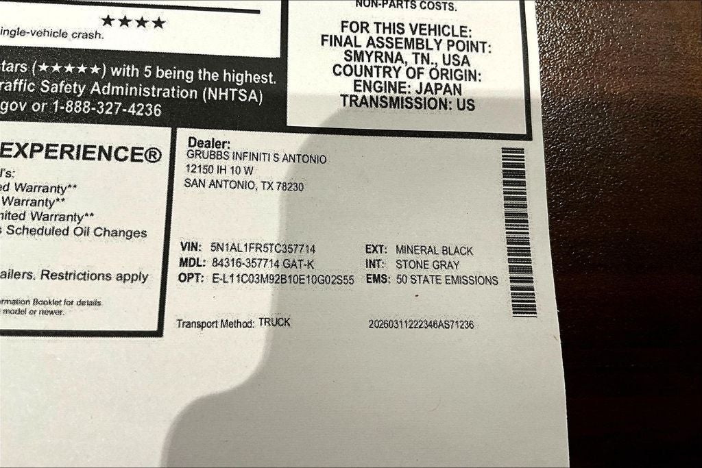 Contact us now to find out why so many customers from across the US rely on Grubbs INFINITI of San Antonio, a family owned business since 1948, to meet their automotive needs! Outside of San Antonio area, no problem, we offer: Reliable, affordable and fast shipping options Nationwide- Our shipping partners are licensed, bonded, fully insured & experienced with high-end vehicles. Hassle free and competitive financing options - Let us leverage our relationships with leading Banks & Credit Unions to get you the lowest rates and best terms for all credit types. Whether you're shopping for a new INFINITI or a quality used pre-owned vehicle you'll receive the same first-class experience from our certified staff of factory trained specialists. Call us today 210-728-3486 or visit us at www.INFINITIofsanantonio.com. .$5000 - Retail Cash. Exp. 05/04/2026
