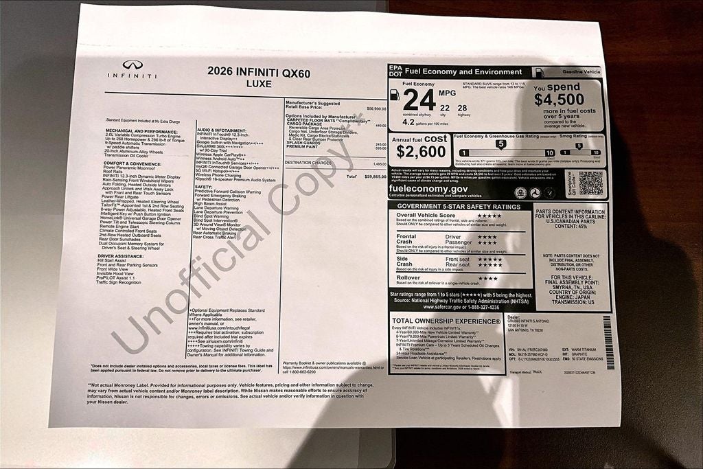 Grubbs INFINITI of San Antonio The only Authorized INFINITI Dealer in San Antonio with the largest New and Pre-Owned INFINITI Selection in the area. This 2026 INFINITI QX60 LUXE comes with 3 Year INFINITI Recommended Maintenance Included at no charge and is loaded with the following Factory Options: Cargo Package (Cargo Blocks, Cargo Mat, Cargo Net, Clear Rear Bumper Film, and Medic Kit), 16 Speakers, 3rd row seats: bench, 4-Wheel Disc Brakes, ABS brakes, Air Conditioning, Alloy wheels, AM/FM radio: SiriusXM with 360L, Anti-whiplash front head restraints, Apple CarPlay/Android Auto, Auto High-beam Headlights, Auto tilt-away steering wheel, Auto-dimming door mirrors, Auto-dimming Rear-View mirror, Automatic temperature control, Bose Performance Series 17-Speaker Sound System, Brake assist, Bumpers: body-color, Climate Controlled Front Bucket Seats, Delay-off headlights, Driver door bin, Driver vanity mirror, Dual front impact airbags, Dual front side impact airbags, Electronic Stability Control, Emergency communication system: INFINITI InTouch, Four wheel independent suspension, Front anti-roll bar, Front Bucket Seats, Front Center Armrest, Front dual zone A/C, Front reading lights, Fully automatic headlights, Garage door transmitter: HomeLink, Heated door mirrors, Heated front seats, Heated rear seats, Heated steering wheel, Illuminated entry, Knee airbag, Leather Shift Knob, Leather steering wheel, Low tire pressure warning, Memory seat, Navigation system: Google Built-in, Occupant sensing airbag, Outside temperature display, Overhead airbag, Overhead console, Panic alarm, Passenger door bin, Passenger vanity mirror, Power door mirrors, Power driver seat, Power Liftgate, Power moonroof: Panoramic, Power passenger seat, Power steering, Power windows, Premium Paint, Radio data system, Radio: Klipsch Premium Audio System, Rain sensing wipers, Rear air conditioning, Rear anti-roll bar, Rear reading lights, Rear seat center armrest, Rear side impact airbag, Rear window defroster, Rear window wiper, Reclining 3rd row seat, Remote keyless entry, Security system, Speed control, Speed-sensing steering, Speed-Sensitive Wipers, Splash Guards, Split folding rear seat, Spoiler, Steering wheel memory, Steering wheel mounted audio controls, Tachometer, Tailorfit-Appointed Seating Surfaces, Telescoping steering wheel, Tilt steering wheel, Traction control, Trip computer, Turn signal indicator mirrors, Variably intermittent wipers, Ventilated front seats, and Wheels: 20 x 8J Machined Aluminum Alloy!! Priced below KBB Fair Purchase Price!