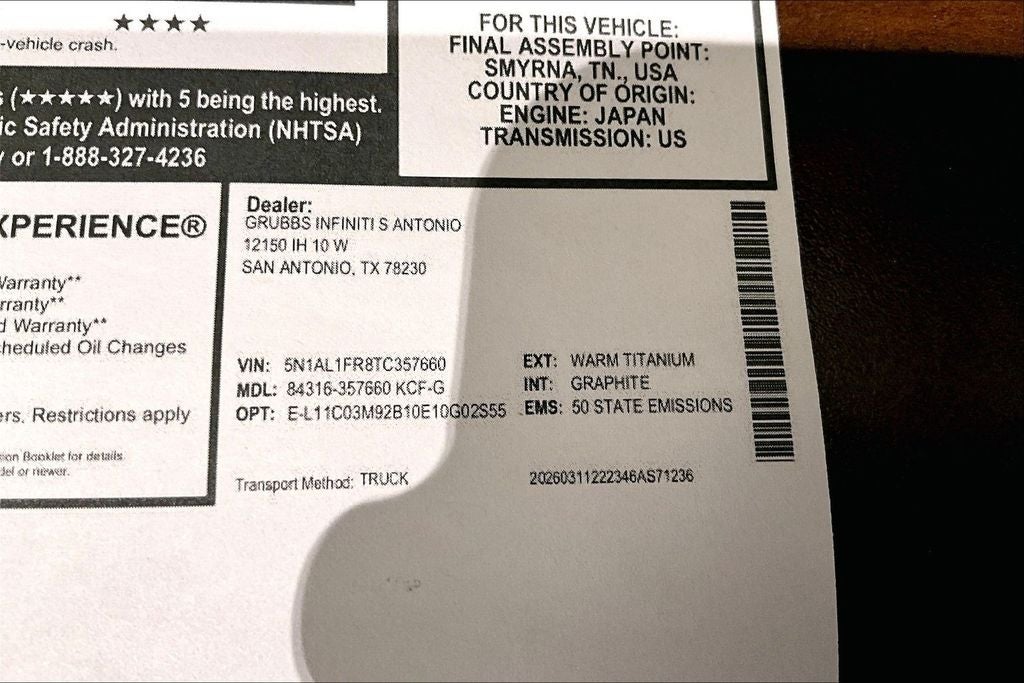 Contact us now to find out why so many customers from across the US rely on Grubbs INFINITI of San Antonio, a family owned business since 1948, to meet their automotive needs! Outside of San Antonio area, no problem, we offer: Reliable, affordable and fast shipping options Nationwide- Our shipping partners are licensed, bonded, fully insured & experienced with high-end vehicles. Hassle free and competitive financing options - Let us leverage our relationships with leading Banks & Credit Unions to get you the lowest rates and best terms for all credit types. Whether you're shopping for a new INFINITI or a quality used pre-owned vehicle you'll receive the same first-class experience from our certified staff of factory trained specialists. Call us today 210-728-3486 or visit us at www.INFINITIofsanantonio.com. .$5000 - Retail Cash. Exp. 05/04/2026 Price excludes $1995 of dealer added accessories.