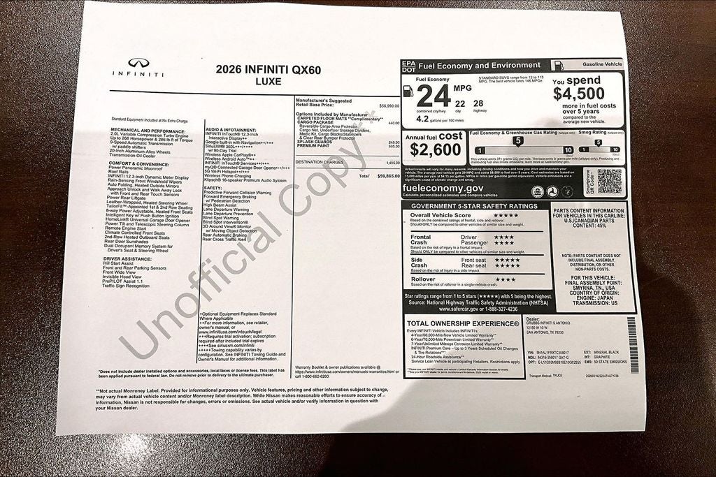 Grubbs INFINITI of San Antonio The only Authorized INFINITI Dealer in San Antonio with the largest New and Pre-Owned INFINITI Selection in the area. This 2026 INFINITI QX60 LUXE comes with 3 Year INFINITI Recommended Maintenance Included at no charge and is loaded with the following Factory Options: Cargo Package (Cargo Blocks, Cargo Mat, Cargo Net, Clear Rear Bumper Film, and Medic Kit), 16 Speakers, 3rd row seats: bench, 4-Wheel Disc Brakes, ABS brakes, Air Conditioning, Alloy wheels, AM/FM radio: SiriusXM with 360L, Anti-whiplash front head restraints, Apple CarPlay/Android Auto, Auto High-beam Headlights, Auto tilt-away steering wheel, Auto-dimming door mirrors, Auto-dimming Rear-View mirror, Automatic temperature control, Bose Performance Series 17-Speaker Sound System, Brake assist, Bumpers: body-color, Climate Controlled Front Bucket Seats, Delay-off headlights, Driver door bin, Driver vanity mirror, Dual front impact airbags, Dual front side impact airbags, Electronic Stability Control, Emergency communication system: INFINITI InTouch, Four wheel independent suspension, Front anti-roll bar, Front Bucket Seats, Front Center Armrest, Front dual zone A/C, Front reading lights, Fully automatic headlights, Garage door transmitter: HomeLink, Heated door mirrors, Heated front seats, Heated rear seats, Heated steering wheel, Illuminated entry, Knee airbag, Leather Shift Knob, Leather steering wheel, Low tire pressure warning, Memory seat, Navigation system: Google Built-in, Occupant sensing airbag, Outside temperature display, Overhead airbag, Overhead console, Panic alarm, Passenger door bin, Passenger vanity mirror, Power door mirrors, Power driver seat, Power Liftgate, Power moonroof: Panoramic, Power passenger seat, Power steering, Power windows, Premium Paint, Radio data system, Radio: Klipsch Premium Audio System, Rain sensing wipers, Rear air conditioning, Rear anti-roll bar, Rear reading lights, Rear seat center armrest, Rear side impact airbag, Rear window defroster, Rear window wiper, Reclining 3rd row seat, Remote keyless entry, Security system, Speed control, Speed-sensing steering, Speed-Sensitive Wipers, Splash Guards, Split folding rear seat, Spoiler, Steering wheel memory, Steering wheel mounted audio controls, Tachometer, Tailorfit-Appointed Seating Surfaces, Telescoping steering wheel, Tilt steering wheel, Traction control, Trip computer, Turn signal indicator mirrors, Variably intermittent wipers, Ventilated front seats, and Wheels: 20 x 8J Machined Aluminum Alloy!! Priced below KBB Fair Purchase Price!