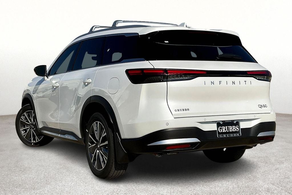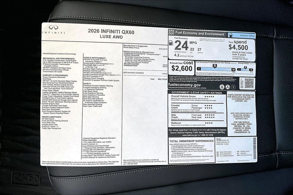 Grubbs INFINITI – The Only Authorized INFINITI Dealer in Grapevine Proudly serving drivers across the U.S. Since 1948! Explore one of the largest selections of New and Pre-Owned INFINITI vehicles in the area — all backed by our commitment to excellence and exceptional customer service. Every New Grubbs INFINITI comes with: Our Exclusive Lifetime Powertrain Warranty 3 Years of INFINITI-Recommended Maintenance – Included, with No Charge Valet Service when servicing your vehicle with pick up and drop at work or home and Hassle-Free Nationwide Shipping is Available. This 2026 INFINITI QX60 LUXE in Radiant White with Premium Graphite interior is equipped with the following high value Features Cargo Package (Cargo Net, Clear Rear Bumper Film, and Medic Kit), 17 Speakers, 3rd row seats: bench, 4-Wheel Disc Brakes, ABS brakes, Air Conditioning, Alloy wheels, AM/FM radio: SiriusXM with 360L, Anti-whiplash front head restraints, Apple CarPlay/Android Auto, Auto High-beam Headlights, Auto tilt-away steering wheel, Auto-dimming door mirrors, Auto-dimming Rear-View mirror, Automatic temperature control, Bose Performance Series 17-Speaker Sound System, Brake assist, Bumpers: body-color, Carpeted Floor Mats with Bench Seats on 3rd Row Tray, Climate Controlled Front Bucket Seats, Delay-off headlights, Driver door bin, Driver vanity mirror, Dual front impact airbags, Dual front side impact airbags, Electronic Stability Control, Emergency communication system: INFINITI InTouch, Four wheel independent suspension, Front anti-roll bar, Front Bucket Seats, Front Center Armrest, Front dual zone A/C, Front reading lights, Fully automatic headlights, Garage door transmitter: HomeLink, Heated door mirrors, Heated front seats, Heated rear seats, Heated steering wheel, Illuminated entry, Knee airbag, Leather Shift Knob, Leather steering wheel, Literature Kit, Low tire pressure warning, Memory seat, Navigation system: Google Built-in, Occupant sensing airbag, Outside temperature display, Overhead airbag, Overhead console, Panic alarm, Passenger door bin, Passenger vanity mirror, Power door mirrors, Power driver seat, Power Liftgate, Power moonroof: Panoramic, Power passenger seat, Power steering, Power windows, Radio data system, Radio: Klipsch Premium Audio System, Rain sensing wipers, Rear air conditioning, Rear anti-roll bar, Rear reading lights, Rear seat center armrest, Rear side impact airbag, Rear window defroster, Rear window wiper, Reclining 3rd row seat, Remote keyless entry, Security system, Speed control, Speed-sensing steering, Speed-Sensitive Wipers, Splash Guards, Split folding rear seat, Spoiler, Steering wheel memory, Steering wheel mounted audio controls, Super Premium Paint, Tachometer, Tailorfit-Appointed Seating Surfaces, Telescoping steering wheel, Tilt steering wheel, Traction control, Trip computer, Turn signal indicator mirrors, Variably intermittent wipers, Ventilated front seats, and Wheels: 20 x 8J Machined Aluminum Alloy.