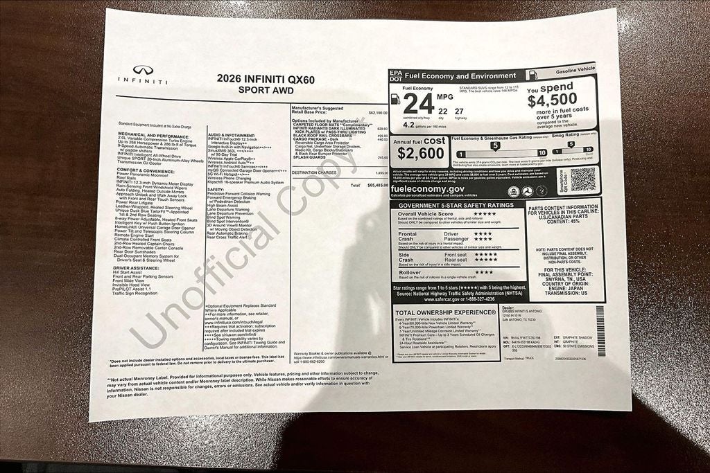 Grubbs INFINITI of San Antonio The only Authorized INFINITI Dealer in San Antonio with the largest New and Pre-Owned INFINITI Selection in the area. This 2026 INFINITI QX60 SPORT comes with 3 Year INFINITI Recommended Maintenance Included at no charge and is loaded with the following Factory Options: Dark Cargo Package (Black Rear Bumper Film, Cargo Blocks, Cargo Mat, and Medic Kit), 17 Speakers, 3rd row seats: bench, 4-Wheel Disc Brakes, ABS brakes, Air Conditioning, Alloy wheels, AM/FM radio: SiriusXM with 360L, Anti-whiplash front head restraints, Apple CarPlay/Android Auto, Auto High-beam Headlights, Auto tilt-away steering wheel, Auto-dimming door mirrors, Auto-dimming Rear-View mirror, Automatic temperature control, Black Roof Rail Crossbars, Bose Performance Series 17-Speaker Sound System, Brake assist, Bumpers: body-color, Climate Controlled Front Bucket Seats, Delay-off headlights, Driver door bin, Driver vanity mirror, Dual front impact airbags, Dual front side impact airbags, Electronic Stability Control, Emergency communication system: INFINITI InTouch, Four wheel independent suspension, Front anti-roll bar, Front Bucket Seats, Front Center Armrest, Front dual zone A/C, Front reading lights, Fully automatic headlights, Garage door transmitter: HomeLink, Genuine wood door panel insert, Heated door mirrors, Heated front seats, Heated rear seats, Heated steering wheel, Illuminated entry, INFINITI Radiant Dark Illuminated Kick Plates, Knee airbag, Leather Shift Knob, Leather steering wheel, Low tire pressure warning, Memory seat, Navigation system: Google Built-in, Occupant sensing airbag, Outside temperature display, Overhead airbag, Overhead console, Panic alarm, Passenger door bin, Passenger vanity mirror, Power door mirrors, Power driver seat, Power Liftgate, Power moonroof: Panoramic, Power passenger seat, Power steering, Power windows, Radio data system, Radio: Klipsch Premium Audio System, Rain sensing wipers, Rear air conditioning, Rear anti-roll bar, Rear reading lights, Rear side impact airbag, Rear window defroster, Rear window wiper, Reclining 3rd row seat, Remote keyless entry, Security system, Speed control, Speed-sensing steering, Speed-Sensitive Wipers, Splash Guards, Split folding rear seat, Spoiler, Steering wheel memory, Steering wheel mounted audio controls, Tachometer, Tailorfit-Appointed Seating Surfaces, Telescoping steering wheel, Tilt steering wheel, Traction control, Trip computer, Turn signal indicator mirrors, Variably intermittent wipers, Ventilated front seats, and Wheels: 20 x 8J Unique Sporty Machined Aluminum Alloy!! Priced below KBB Fair Purchase Price!