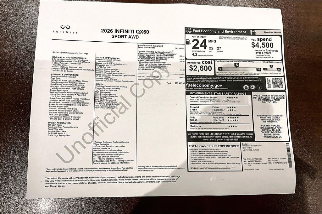 Grubbs INFINITI of San Antonio The only Authorized INFINITI Dealer in San Antonio with the largest New and Pre-Owned INFINITI Selection in the area. This 2026 INFINITI QX60 SPORT comes with 3 Year INFINITI Recommended Maintenance Included at no charge and is loaded with the following Factory Options: Dark Cargo Package (Black Rear Bumper Film, Cargo Blocks, Cargo Mat, and Medic Kit), 17 Speakers, 3rd row seats: bench, 4-Wheel Disc Brakes, ABS brakes, Air Conditioning, Alloy wheels, AM/FM radio: SiriusXM with 360L, Anti-whiplash front head restraints, Apple CarPlay/Android Auto, Auto High-beam Headlights, Auto tilt-away steering wheel, Auto-dimming door mirrors, Auto-dimming Rear-View mirror, Automatic temperature control, Black Roof Rail Crossbars, Bose Performance Series 17-Speaker Sound System, Brake assist, Bumpers: body-color, Climate Controlled Front Bucket Seats, Delay-off headlights, Driver door bin, Driver vanity mirror, Dual front impact airbags, Dual front side impact airbags, Electronic Stability Control, Emergency communication system: INFINITI InTouch, Four wheel independent suspension, Front anti-roll bar, Front Bucket Seats, Front Center Armrest, Front dual zone A/C, Front reading lights, Fully automatic headlights, Garage door transmitter: HomeLink, Genuine wood door panel insert, Heated door mirrors, Heated front seats, Heated rear seats, Heated steering wheel, Illuminated entry, INFINITI Radiant Dark Illuminated Kick Plates, Knee airbag, Leather Shift Knob, Leather steering wheel, Low tire pressure warning, Memory seat, Navigation system: Google Built-in, Occupant sensing airbag, Outside temperature display, Overhead airbag, Overhead console, Panic alarm, Passenger door bin, Passenger vanity mirror, Power door mirrors, Power driver seat, Power Liftgate, Power moonroof: Panoramic, Power passenger seat, Power steering, Power windows, Radio data system, Radio: Klipsch Premium Audio System, Rain sensing wipers, Rear air conditioning, Rear anti-roll bar, Rear reading lights, Rear side impact airbag, Rear window defroster, Rear window wiper, Reclining 3rd row seat, Remote keyless entry, Security system, Speed control, Speed-sensing steering, Speed-Sensitive Wipers, Splash Guards, Split folding rear seat, Spoiler, Steering wheel memory, Steering wheel mounted audio controls, Tachometer, Tailorfit-Appointed Seating Surfaces, Telescoping steering wheel, Tilt steering wheel, Traction control, Trip computer, Turn signal indicator mirrors, Variably intermittent wipers, Ventilated front seats, and Wheels: 20 x 8J Unique Sporty Machined Aluminum Alloy!! Priced below KBB Fair Purchase Price!