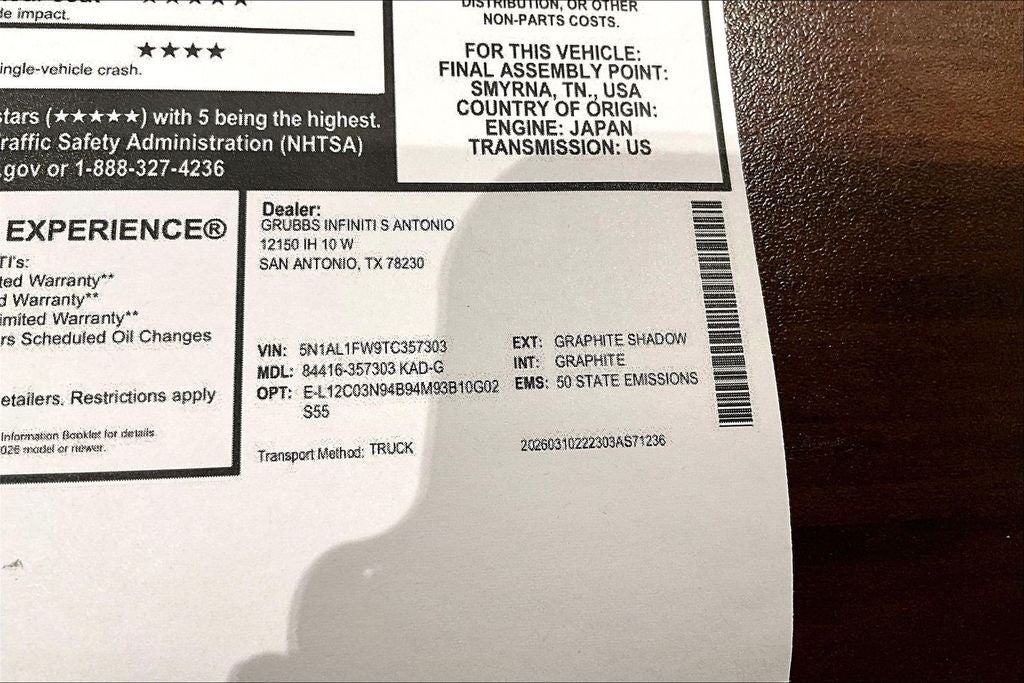 Contact us now to find out why so many customers from across the US rely on Grubbs INFINITI of San Antonio, a family owned business since 1948, to meet their automotive needs! Outside of San Antonio area, no problem, we offer: Reliable, affordable and fast shipping options Nationwide- Our shipping partners are licensed, bonded, fully insured & experienced with high-end vehicles. Hassle free and competitive financing options - Let us leverage our relationships with leading Banks & Credit Unions to get you the lowest rates and best terms for all credit types. Whether you're shopping for a new INFINITI or a quality used pre-owned vehicle you'll receive the same first-class experience from our certified staff of factory trained specialists. Call us today 210-728-3486 or visit us at www.INFINITIofsanantonio.com. .$6000 - Retail Cash. Exp. 05/04/2026 Price excludes $1995 of dealer added accessories.