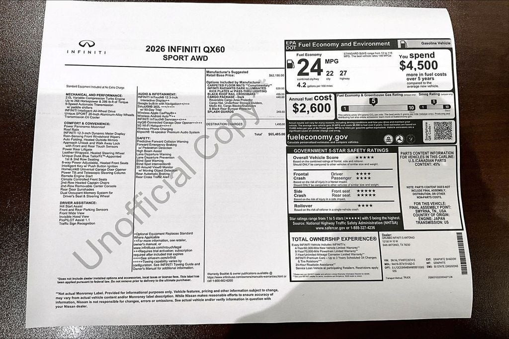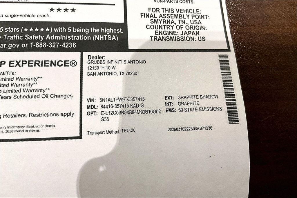 Grubbs INFINITI of San Antonio The only Authorized INFINITI Dealer in San Antonio with the largest New and Pre-Owned INFINITI Selection in the area. This 2026 INFINITI QX60 SPORT comes with 3 Year INFINITI Recommended Maintenance Included at no charge and is loaded with the following Factory Options: Dark Cargo Package (Black Rear Bumper Film, Cargo Blocks, Cargo Mat, and Medic Kit), 17 Speakers, 3rd row seats: bench, 4-Wheel Disc Brakes, ABS brakes, Air Conditioning, Alloy wheels, AM/FM radio: SiriusXM with 360L, Anti-whiplash front head restraints, Apple CarPlay/Android Auto, Auto High-beam Headlights, Auto tilt-away steering wheel, Auto-dimming door mirrors, Auto-dimming Rear-View mirror, Automatic temperature control, Black Roof Rail Crossbars, Bose Performance Series 17-Speaker Sound System, Brake assist, Bumpers: body-color, Climate Controlled Front Bucket Seats, Delay-off headlights, Driver door bin, Driver vanity mirror, Dual front impact airbags, Dual front side impact airbags, Electronic Stability Control, Emergency communication system: INFINITI InTouch, Four wheel independent suspension, Front anti-roll bar, Front Bucket Seats, Front Center Armrest, Front dual zone A/C, Front reading lights, Fully automatic headlights, Garage door transmitter: HomeLink, Genuine wood door panel insert, Heated door mirrors, Heated front seats, Heated rear seats, Heated steering wheel, Illuminated entry, INFINITI Radiant Dark Illuminated Kick Plates, Knee airbag, Leather Shift Knob, Leather steering wheel, Low tire pressure warning, Memory seat, Navigation system: Google Built-in, Occupant sensing airbag, Outside temperature display, Overhead airbag, Overhead console, Panic alarm, Passenger door bin, Passenger vanity mirror, Power door mirrors, Power driver seat, Power Liftgate, Power moonroof: Panoramic, Power passenger seat, Power steering, Power windows, Radio data system, Radio: Klipsch Premium Audio System, Rain sensing wipers, Rear air conditioning, Rear anti-roll bar, Rear reading lights, Rear side impact airbag, Rear window defroster, Rear window wiper, Reclining 3rd row seat, Remote keyless entry, Security system, Speed control, Speed-sensing steering, Speed-Sensitive Wipers, Splash Guards, Split folding rear seat, Spoiler, Steering wheel memory, Steering wheel mounted audio controls, Tachometer, Tailorfit-Appointed Seating Surfaces, Telescoping steering wheel, Tilt steering wheel, Traction control, Trip computer, Turn signal indicator mirrors, Variably intermittent wipers, Ventilated front seats, and Wheels: 20 x 8J Unique Sporty Machined Aluminum Alloy!! Priced below KBB Fair Purchase Price!