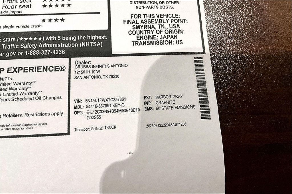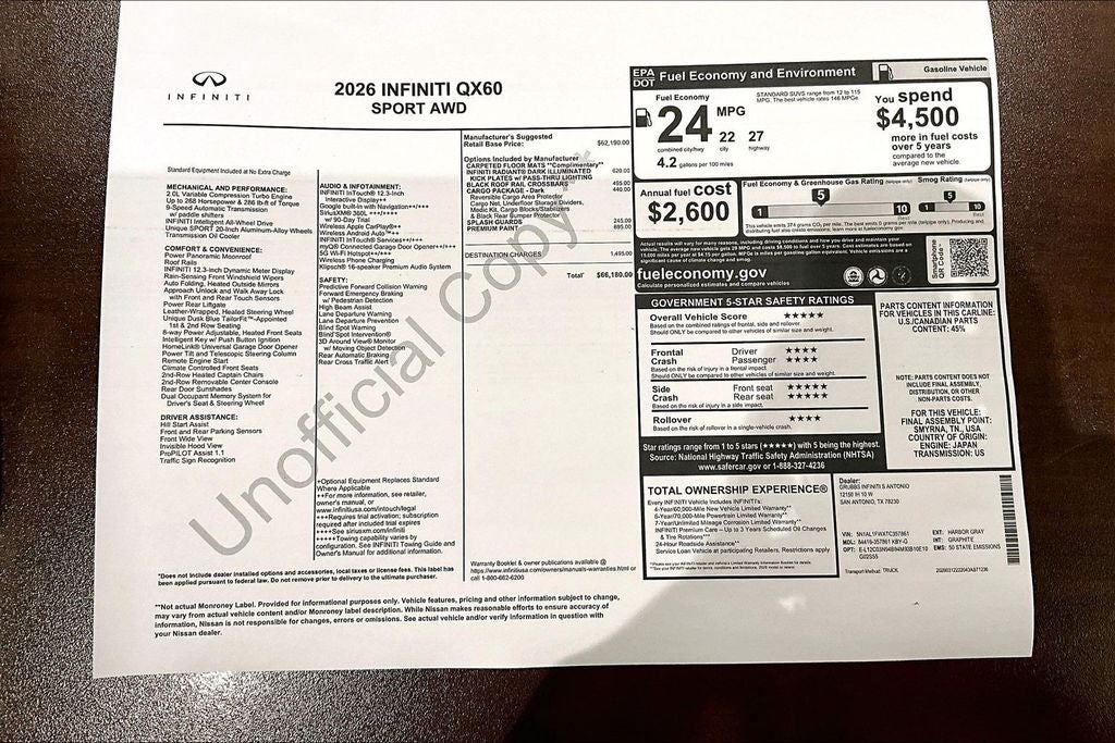 Grubbs INFINITI of San Antonio The only Authorized INFINITI Dealer in San Antonio with the largest New and Pre-Owned INFINITI Selection in the area. This 2026 INFINITI QX60 SPORT comes with 3 Year INFINITI Recommended Maintenance Included at no charge and is loaded with the following Factory Options: Dark Cargo Package (Black Rear Bumper Film, Cargo Blocks, Cargo Mat, and Medic Kit), 17 Speakers, 3rd row seats: bench, 4-Wheel Disc Brakes, ABS brakes, Air Conditioning, Alloy wheels, AM/FM radio: SiriusXM with 360L, Anti-whiplash front head restraints, Apple CarPlay/Android Auto, Auto High-beam Headlights, Auto tilt-away steering wheel, Auto-dimming door mirrors, Auto-dimming Rear-View mirror, Automatic temperature control, Black Roof Rail Crossbars, Bose Performance Series 17-Speaker Sound System, Brake assist, Bumpers: body-color, Climate Controlled Front Bucket Seats, Delay-off headlights, Driver door bin, Driver vanity mirror, Dual front impact airbags, Dual front side impact airbags, Electronic Stability Control, Emergency communication system: INFINITI InTouch, Four wheel independent suspension, Front anti-roll bar, Front Bucket Seats, Front Center Armrest, Front dual zone A/C, Front reading lights, Fully automatic headlights, Garage door transmitter: HomeLink, Genuine wood door panel insert, Heated door mirrors, Heated front seats, Heated rear seats, Heated steering wheel, Illuminated entry, INFINITI Radiant Dark Illuminated Kick Plates, Knee airbag, Leather Shift Knob, Leather steering wheel, Low tire pressure warning, Memory seat, Navigation system: Google Built-in, Occupant sensing airbag, Outside temperature display, Overhead airbag, Overhead console, Panic alarm, Passenger door bin, Passenger vanity mirror, Power door mirrors, Power driver seat, Power Liftgate, Power moonroof: Panoramic, Power passenger seat, Power steering, Power windows, Premium Paint, Radio data system, Radio: Klipsch Premium Audio System, Rain sensing wipers, Rear air conditioning, Rear anti-roll bar, Rear reading lights, Rear side impact airbag, Rear window defroster, Rear window wiper, Reclining 3rd row seat, Remote keyless entry, Security system, Speed control, Speed-sensing steering, Speed-Sensitive Wipers, Splash Guards, Split folding rear seat, Spoiler, Steering wheel memory, Steering wheel mounted audio controls, Tachometer, Tailorfit-Appointed Seating Surfaces, Telescoping steering wheel, Tilt steering wheel, Traction control, Trip computer, Turn signal indicator mirrors, Variably intermittent wipers, Ventilated front seats, and Wheels: 20 x 8J Unique Sporty Machined Aluminum Alloy!! Priced below KBB Fair Purchase Price!