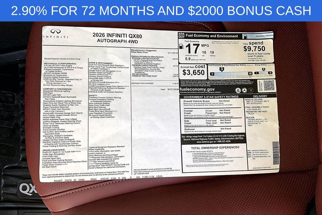 Grubbs INFINITI – The Only Authorized INFINITI Dealer in Grapevine Proudly serving drivers across the U.S. Since 1948! Explore one of the largest selections of New and Pre-Owned INFINITI vehicles in the area — all backed by our commitment to excellence and exceptional customer service. Every New Grubbs INFINITI comes with: Our Exclusive Lifetime Powertrain Warranty 3 Years of INFINITI-Recommended Maintenance – Included, with No Charge Valet Service when servicing your vehicle with pick up and drop at work or home and Hassle-Free Nationwide Shipping is Available. This 2026 INFINITI QX80 AUTOGRAPH in Dynamic Metal/Black Obsidian with Premium Burgundy interior is equipped with the following high value Features Black Interior Lighting Package (INFINITI Radiant Black Cargo Scuff Plates and Panoramic Illuminated Headliner), Premium Cargo Package (Cargo Blocks/Stabilizers, Carpeted Cargo Area Protector, Console Net, and Soft-Sided Cargo Cooler), 3rd row seats: bench, 4-Wheel Disc Brakes, ABS brakes, Adaptive suspension, Air Conditioning, Anti-whiplash front head restraints, Apple CarPlay/Android Auto, Auto High-beam Headlights, Auto tilt-away steering wheel, Auto-dimming door mirrors, Auto-dimming Rear-View mirror, Auto-leveling suspension, Automatic temperature control, Bumpers: body-color, Compass, Delay-off headlights, Driver door bin, Driver vanity mirror, Dual front impact airbags, Dual front side impact airbags, Four wheel independent suspension, Front anti-roll bar, Front Bucket Seats, Front Center Armrest, Front dual zone A/C, Front reading lights, Fully automatic headlights, Garage door transmitter: myQ Connected Garage, Genuine wood dashboard insert, Genuine wood door panel insert, Heads-Up Display, Heated and Climate Controlled Front Bucket Seats with Massage, Heated door mirrors, Heated front seats, Heated rear seats, Heated steering wheel, HVAC memory, Illuminated entry, Knee airbag, Leather steering wheel, Low tire pressure warning, Memory seat, Navigation system: Google Built-in, Occupant sensing airbag, Outside temperature display, Overhead airbag, Overhead console, Panic alarm, Passenger vanity mirror, Power door mirrors, Power driver seat, Power Liftgate, Power moonroof, Power passenger seat, Power steering, Power windows, Radio: Klipsch Premiere Audio System, Rain sensing wipers, Rear air conditioning, Rear anti-roll bar, Rear reading lights, Rear seat center armrest, Rear window defroster, Rear window wiper, Reclining 3rd row seat, Remote keyless entry, Security system, Semi-Aniline Premium Leather Seating Surfaces, Speed control, Speed-sensing steering, Splash Guards, Split folding rear seat, Spoiler, Steering wheel memory, Steering wheel mounted audio controls, Tachometer, Telescoping steering wheel, Tilt steering wheel, Traction control, Trip computer, Turn signal indicator mirrors, Two-Tone Premium Paint, Variably intermittent wipers, Ventilated front seats, Ventilated rear seats, and Wheels: 22 x 8.5J Cast Aluminum-Alloy.