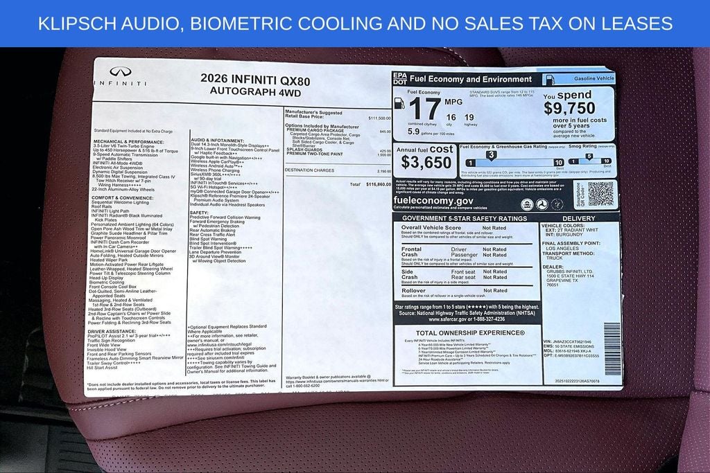 Grubbs INFINITI – The Only Authorized INFINITI Dealer in Grapevine Proudly serving drivers across the U.S. Since 1948! Explore one of the largest selections of New and Pre-Owned INFINITI vehicles in the area — all backed by our commitment to excellence and exceptional customer service. Every New Grubbs INFINITI comes with: Our Exclusive Lifetime Powertrain Warranty 3 Years of INFINITI-Recommended Maintenance – Included, with No Charge Valet Service when servicing your vehicle with pick up and drop at work or home and Hassle-Free Nationwide Shipping is Available. This 2026 INFINITI QX80 AUTOGRAPH in Radiant White/Black Obsidian with Premium Burgundy interior is equipped with the following high value Features Premium Cargo Package (Carpeted Cargo Area Protector, Console Net, and Soft-Sided Cargo Cooler), 3rd row seats: bench, 4-Wheel Disc Brakes, ABS brakes, Adaptive suspension, Air Conditioning, AM/FM radio: SiriusXM with 360L, Anti-whiplash front head restraints, Apple CarPlay/Android Auto, Audio memory, Auto High-beam Headlights, Auto tilt-away steering wheel, Auto-dimming door mirrors, Auto-dimming Rear-View mirror, Auto-leveling suspension, Automatic temperature control, Bumpers: body-color, Compass, Delay-off headlights, Driver door bin, Driver vanity mirror, Dual front impact airbags, Dual front side impact airbags, Electronic Stability Control, Emergency communication system: INFINITI InTouch, Four wheel independent suspension, Front anti-roll bar, Front Bucket Seats, Front Center Armrest, Front dual zone A/C, Front reading lights, Fully automatic headlights, Garage door transmitter: myQ Connected Garage, Genuine wood dashboard insert, Genuine wood door panel insert, Heads-Up Display, Heated and Climate Controlled Front Bucket Seats with Massage, Heated door mirrors, Heated front seats, Heated rear seats, Heated steering wheel, HVAC memory, Illuminated entry, Knee airbag, Leather steering wheel, Low tire pressure warning, Memory seat, Navigation system: Google Built-in, Occupant sensing airbag, Outside temperature display, Overhead airbag, Overhead console, Panic alarm, Passenger door bin, Passenger vanity mirror, Power door mirrors, Power driver seat, Power Liftgate, Power moonroof, Power passenger seat, Power steering, Power windows, Radio: Klipsch Premiere Audio System, Rain sensing wipers, Rear air conditioning, Rear anti-roll bar, Rear reading lights, Rear seat center armrest, Rear window defroster, Rear window wiper, Reclining 3rd row seat, Remote keyless entry, Security system, Semi-Aniline Premium Leather Seating Surfaces, Speed control, Speed-sensing steering, Split folding rear seat, Spoiler, Steering wheel memory, Steering wheel mounted audio controls, Tachometer, Telescoping steering wheel, Tilt steering wheel, Traction control, Trip computer, Turn signal indicator mirrors, Two-Tone Super Premium Paint, Variably intermittent wipers, Ventilated front seats, Ventilated rear seats, and Wheels: 22 x 8.5J Cast Aluminum-Alloy.