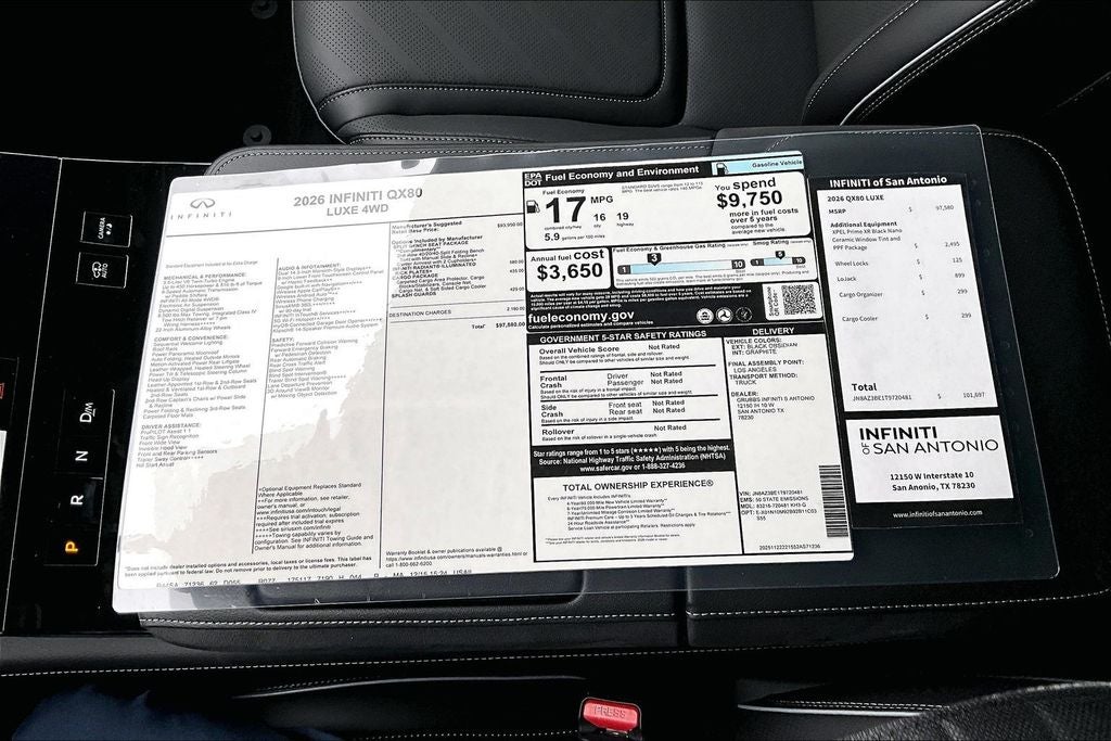 Grubbs INFINITI of San Antonio The only Authorized INFINITI Dealer in San Antonio with the largest New and Pre-Owned INFINITI Selection in the area. This 2026 INFINITI QX80 LUXE comes with 3 Year INFINITI Recommended Maintenance Included at no charge and is loaded with the following Factory Options: Cargo Package (Cargo Blocks/Stabilizers, Cargo Net, Carpeted Cargo Area Protector, Console Net, and Soft-Sided Cargo Cooler), Split Bench Seat Package, 14 Speakers, 3rd row seats: bench, 4-Wheel Disc Brakes, ABS brakes, Adaptive suspension, Air Conditioning, Alloy wheels, AM/FM radio: SiriusXM with 360L, Anti-whiplash front head restraints, Apple CarPlay/Android Auto, Audio memory, Auto High-beam Headlights, Auto tilt-away steering wheel, Auto-dimming door mirrors, Auto-dimming Rear-View mirror, Auto-leveling suspension, Automatic temperature control, Brake assist, Bumpers: body-color, Compass, Delay-off headlights, Driver door bin, Driver vanity mirror, Dual front impact airbags, Dual front side impact airbags, Electronic Stability Control, Emergency communication system: INFINITI InTouch, Four wheel independent suspension, Front anti-roll bar, Front Bucket Seats, Front Center Armrest, Front dual zone A/C, Front reading lights, Fully automatic headlights, Garage door transmitter: myQ Connected Garage, Heads-Up Display, Heated and Climate Controlled Front Bucket Seats, Heated door mirrors, Heated front seats, Heated rear seats, Heated steering wheel, HVAC memory, Illuminated entry, INFINITI Radiant Illuminated Silver Kick Plates, Knee airbag, Leather Seating Surfaces, Leather steering wheel, Low tire pressure warning, Memory seat, Navigation system: Google Built-in, Occupant sensing airbag, Outside temperature display, Overhead airbag, Overhead console, Panic alarm, Passenger door bin, Passenger vanity mirror, Power door mirrors, Power driver seat, Power Liftgate, Power moonroof, Power passenger seat, Power steering, Power windows, Radio data system, Radio: Klipsch Premium Audio System, Rain sensing wipers, Rear air conditioning, Rear anti-roll bar, Rear reading lights, Rear seat center armrest, Rear window defroster, Rear window wiper, Reclining 3rd row seat, Remote keyless entry, Security system, Speed control, Speed-sensing steering, Splash Guards, Split folding rear seat, Spoiler, Steering wheel memory, Steering wheel mounted audio controls, Tachometer, Telescoping steering wheel, Tilt steering wheel, Traction control, Trip computer, Turn signal indicator mirrors, Variably intermittent wipers, Ventilated front seats, Ventilated rear seats, and Wheels: 22 x 8.5J Cast Aluminum Alloy!! Priced below KBB Fair Purchase Price!