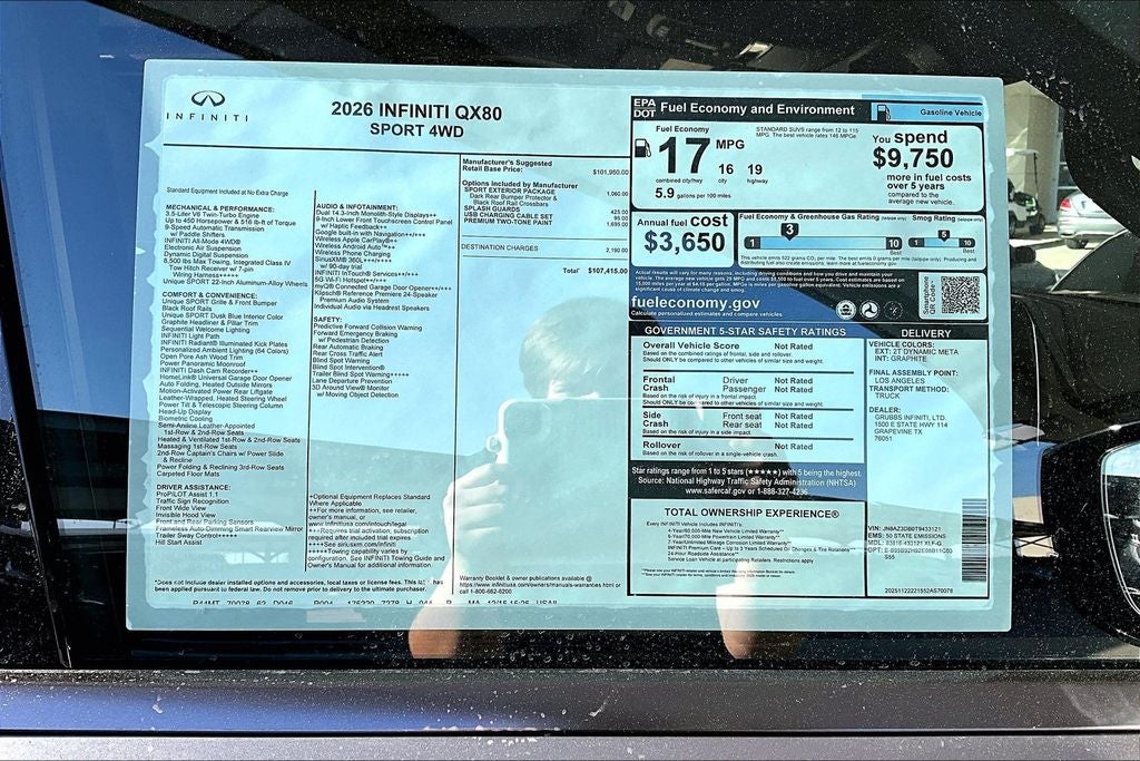 Grubbs INFINITI – The Only Authorized INFINITI Dealer in Grapevine Proudly serving drivers across the U.S. Since 1948! Explore one of the largest selections of New and Pre-Owned INFINITI vehicles in the area — all backed by our commitment to excellence and exceptional customer service. Every New Grubbs INFINITI comes with: Our Exclusive Lifetime Powertrain Warranty 3 Years of INFINITI-Recommended Maintenance – Included, with No Charge Valet Service when servicing your vehicle with pick up and drop at work or home and Hassle-Free Nationwide Shipping is Available. This 2026 INFINITI QX80 SPORT in Dynamic Metal/Black Obsidian with Premium Graphite interior is equipped with the following high value Features Sport Exterior Package (Black Roof Rail Crossbars and Dark Chrome Rear Bumper Protector), 3rd row seats: bench, 4-Wheel Disc Brakes, ABS brakes, Adaptive suspension, Air Conditioning, Anti-whiplash front head restraints, Apple CarPlay/Android Auto, Auto High-beam Headlights, Auto tilt-away steering wheel, Auto-dimming door mirrors, Auto-dimming Rear-View mirror, Auto-leveling suspension, Automatic temperature control, Brake assist, Compass, Delay-off headlights, Driver door bin, Driver vanity mirror, Dual front impact airbags, Dual front side impact airbags, Electronic Stability Control, Emergency communication system: INFINITI InTouch, Four wheel independent suspension, Front anti-roll bar, Front Bucket Seats, Front Center Armrest, Front dual zone A/C, Front reading lights, Fully automatic headlights, Garage door transmitter: HomeLink, Genuine wood dashboard insert, Genuine wood door panel insert, Heads-Up Display, Heated and Climate Controlled Front Bucket Seats with Massage, Heated door mirrors, Heated front seats, Heated rear seats, Heated steering wheel, HVAC memory, Illuminated entry, Knee airbag, Leather steering wheel, Low tire pressure warning, Memory seat, Navigation system: Google Built-in, Occupant sensing airbag, Outside temperature display, Overhead airbag, Overhead console, Panic alarm, Passenger door bin, Passenger vanity mirror, Power door mirrors, Power driver seat, Power Liftgate, Power moonroof, Power passenger seat, Power steering, Power windows, Radio: Klipsch Premiere Audio System, Rain sensing wipers, Rear air conditioning, Rear anti-roll bar, Rear reading lights, Rear seat center armrest, Rear window defroster, Rear window wiper, Reclining 3rd row seat, Remote keyless entry, Security system, Speed control, Speed-sensing steering, Splash Guards, Split folding rear seat, Spoiler, Steering wheel memory, Steering wheel mounted audio controls, Telescoping steering wheel, Tilt steering wheel, Traction control, Trip computer, Turn signal indicator mirrors, Two-Tone Premium Paint, Unique SPORT Semi-Aniline Leather Seating Surfaces, USB Charging Cable Set, Variably intermittent wipers, Ventilated front seats, Ventilated rear seats, and Wheels: 22 x 8.5J Unique SPORT Alloy.