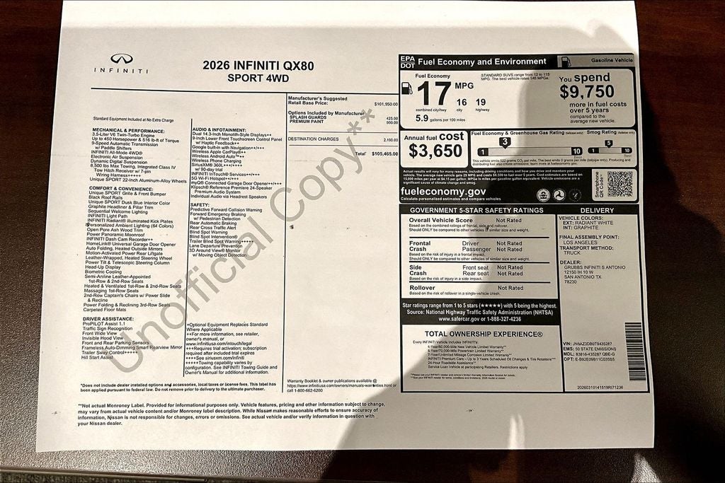 Grubbs INFINITI of San Antonio The only Authorized INFINITI Dealer in San Antonio with the largest New and Pre-Owned INFINITI Selection in the area. This 2026 INFINITI QX80 SPORT comes with 3 Year INFINITI Recommended Maintenance Included at no charge and is loaded with the following Factory Options: Sport Exterior Package (Black Roof Rail Crossbars and Dark Chrome Rear Bumper Protector), 3rd row seats: bench, 4-Wheel Disc Brakes, ABS brakes, Adaptive suspension, Air Conditioning, Alloy wheels, AM/FM radio: SiriusXM with 360L, Anti-whiplash front head restraints, Apple CarPlay/Android Auto, Audio memory, Auto High-beam Headlights, Auto tilt-away steering wheel, Auto-dimming door mirrors, Auto-dimming Rear-View mirror, Auto-leveling suspension, Automatic temperature control, Brake assist, Compass, Delay-off headlights, Driver door bin, Driver vanity mirror, Dual front impact airbags, Dual front side impact airbags, Electronic Stability Control, Emergency communication system: INFINITI InTouch, Four wheel independent suspension, Front anti-roll bar, Front Bucket Seats, Front Center Armrest, Front dual zone A/C, Front reading lights, Fully automatic headlights, Garage door transmitter: HomeLink, Genuine wood dashboard insert, Genuine wood door panel insert, Heads-Up Display, Heated and Climate Controlled Front Bucket Seats with Massage, Heated door mirrors, Heated front seats, Heated rear seats, Heated steering wheel, HVAC memory, Illuminated entry, Knee airbag, Leather steering wheel, Low tire pressure warning, Memory seat, Navigation system: Google Built-in, Occupant sensing airbag, Outside temperature display, Overhead airbag, Overhead console, Panic alarm, Passenger door bin, Passenger vanity mirror, Power door mirrors, Power driver seat, Power Liftgate, Power moonroof, Power passenger seat, Power steering, Power windows, Radio data system, Radio: Klipsch Premiere Audio System, Rain sensing wipers, Rear air conditioning, Rear anti-roll bar, Rear reading lights, Rear seat center armrest, Rear window defroster, Rear window wiper, Reclining 3rd row seat, Remote keyless entry, Security system, Speed control, Speed-sensing steering, Splash Guards, Split folding rear seat, Spoiler, Steering wheel memory, Steering wheel mounted audio controls, Super Premium Paint, Tachometer, Telescoping steering wheel, Tilt steering wheel, Traction control, Trip computer, Turn signal indicator mirrors, Unique SPORT Semi-Aniline Leather Seating Surfaces, Variably intermittent wipers, Ventilated front seats, Ventilated rear seats, and Wheels: 22 x 8.5J Unique SPORT Alloy!! Priced below KBB Fair Purchase Price!