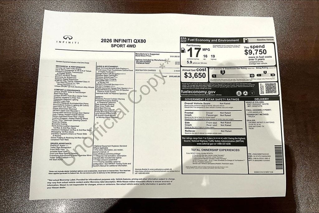 Grubbs INFINITI of San Antonio The only Authorized INFINITI Dealer in San Antonio with the largest New and Pre-Owned INFINITI Selection in the area. This 2026 INFINITI QX80 SPORT comes with 3 Year INFINITI Recommended Maintenance Included at no charge and is loaded with the following Factory Options: Sport Exterior Package (Black Roof Rail Crossbars and Dark Chrome Rear Bumper Protector), 3rd row seats: bench, 4-Wheel Disc Brakes, ABS brakes, Adaptive suspension, Air Conditioning, Alloy wheels, AM/FM radio: SiriusXM with 360L, Anti-whiplash front head restraints, Apple CarPlay/Android Auto, Audio memory, Auto High-beam Headlights, Auto tilt-away steering wheel, Auto-dimming door mirrors, Auto-dimming Rear-View mirror, Auto-leveling suspension, Automatic temperature control, Brake assist, Compass, Delay-off headlights, Driver door bin, Driver vanity mirror, Dual front impact airbags, Dual front side impact airbags, Electronic Stability Control, Emergency communication system: INFINITI InTouch, Four wheel independent suspension, Front anti-roll bar, Front Bucket Seats, Front Center Armrest, Front dual zone A/C, Front reading lights, Fully automatic headlights, Garage door transmitter: HomeLink, Genuine wood dashboard insert, Genuine wood door panel insert, Heads-Up Display, Heated and Climate Controlled Front Bucket Seats with Massage, Heated door mirrors, Heated front seats, Heated rear seats, Heated steering wheel, HVAC memory, Illuminated entry, Knee airbag, Leather steering wheel, Low tire pressure warning, Memory seat, Navigation system: Google Built-in, Occupant sensing airbag, Outside temperature display, Overhead airbag, Overhead console, Panic alarm, Passenger door bin, Passenger vanity mirror, Power door mirrors, Power driver seat, Power Liftgate, Power moonroof, Power passenger seat, Power steering, Power windows, Radio data system, Radio: Klipsch Premiere Audio System, Rain sensing wipers, Rear air conditioning, Rear anti-roll bar, Rear reading lights, Rear seat center armrest, Rear window defroster, Rear window wiper, Reclining 3rd row seat, Remote keyless entry, Security system, Speed control, Speed-sensing steering, Splash Guards, Split folding rear seat, Spoiler, Steering wheel memory, Steering wheel mounted audio controls, Super Premium Paint, Tachometer, Telescoping steering wheel, Tilt steering wheel, Traction control, Trip computer, Turn signal indicator mirrors, Unique SPORT Semi-Aniline Leather Seating Surfaces, Variably intermittent wipers, Ventilated front seats, Ventilated rear seats, and Wheels: 22 x 8.5J Unique SPORT Alloy!! Priced below KBB Fair Purchase Price!