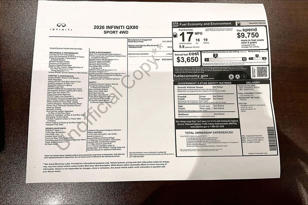 Grubbs INFINITI of San Antonio The only Authorized INFINITI Dealer in San Antonio with the largest New and Pre-Owned INFINITI Selection in the area. This 2026 INFINITI QX80 SPORT comes with 3 Year INFINITI Recommended Maintenance Included at no charge and is loaded with the following Factory Options: Sport Exterior Package (Black Roof Rail Crossbars and Dark Chrome Rear Bumper Protector), 3rd row seats: bench, 4-Wheel Disc Brakes, ABS brakes, Adaptive suspension, Air Conditioning, Alloy wheels, AM/FM radio: SiriusXM with 360L, Anti-whiplash front head restraints, Apple CarPlay/Android Auto, Audio memory, Auto High-beam Headlights, Auto tilt-away steering wheel, Auto-dimming door mirrors, Auto-dimming Rear-View mirror, Auto-leveling suspension, Automatic temperature control, Brake assist, Compass, Delay-off headlights, Driver door bin, Driver vanity mirror, Dual front impact airbags, Dual front side impact airbags, Electronic Stability Control, Emergency communication system: INFINITI InTouch, Four wheel independent suspension, Front anti-roll bar, Front Bucket Seats, Front Center Armrest, Front dual zone A/C, Front reading lights, Fully automatic headlights, Garage door transmitter: HomeLink, Genuine wood dashboard insert, Genuine wood door panel insert, Heads-Up Display, Heated and Climate Controlled Front Bucket Seats with Massage, Heated door mirrors, Heated front seats, Heated rear seats, Heated steering wheel, HVAC memory, Illuminated entry, Knee airbag, Leather steering wheel, Low tire pressure warning, Memory seat, Navigation system: Google Built-in, Occupant sensing airbag, Outside temperature display, Overhead airbag, Overhead console, Panic alarm, Passenger door bin, Passenger vanity mirror, Power door mirrors, Power driver seat, Power Liftgate, Power moonroof, Power passenger seat, Power steering, Power windows, Radio data system, Radio: Klipsch Premiere Audio System, Rain sensing wipers, Rear air conditioning, Rear anti-roll bar, Rear reading lights, Rear seat center armrest, Rear window defroster, Rear window wiper, Reclining 3rd row seat, Remote keyless entry, Security system, Speed control, Speed-sensing steering, Splash Guards, Split folding rear seat, Spoiler, Steering wheel memory, Steering wheel mounted audio controls, Super Premium Paint, Tachometer, Telescoping steering wheel, Tilt steering wheel, Traction control, Trip computer, Turn signal indicator mirrors, Unique SPORT Semi-Aniline Leather Seating Surfaces, Variably intermittent wipers, Ventilated front seats, Ventilated rear seats, and Wheels: 22 x 8.5J Unique SPORT Alloy!! Priced below KBB Fair Purchase Price!