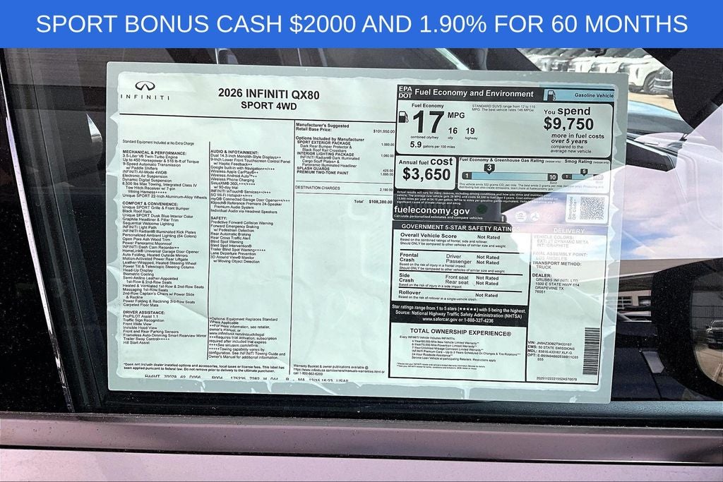 Grubbs INFINITI – The Only Authorized INFINITI Dealer in Grapevine Proudly serving drivers across the U.S. Since 1948! Explore one of the largest selections of New and Pre-Owned INFINITI vehicles in the area — all backed by our commitment to excellence and exceptional customer service. Every New Grubbs INFINITI comes with: Our Exclusive Lifetime Powertrain Warranty 3 Years of INFINITI-Recommended Maintenance – Included, with No Charge Valet Service when servicing your vehicle with pick up and drop at work or home and Hassle-Free Nationwide Shipping is Available. This 2026 INFINITI QX80 SPORT in Dynamic Metal/Black Obsidian with Premium Graphite interior is equipped with the following high value Features Black Interior Lighting Package (INFINITI Radiant Black Cargo Scuff Plates and Panoramic Illuminated Headliner), Sport Exterior Package (Black Roof Rail Crossbars and Dark Chrome Rear Bumper Protector), 3rd row seats: bench, ABS brakes, Adaptive suspension, Air Conditioning, Anti-whiplash front head restraints, Apple CarPlay/Android Auto, Auto High-beam Headlights, Auto tilt-away steering wheel, Auto-dimming door mirrors, Auto-dimming Rear-View mirror, Auto-leveling suspension, Automatic temperature control, Brake assist, Compass, Delay-off headlights, Driver door bin, Driver vanity mirror, Dual front impact airbags, Dual front side impact airbags, Electronic Stability Control, Emergency communication system: INFINITI InTouch, Four wheel independent suspension, Front anti-roll bar, Front Bucket Seats, Front Center Armrest, Front dual zone A/C, Front reading lights, Fully automatic headlights, Garage door transmitter: HomeLink, Genuine wood dashboard insert, Genuine wood door panel insert, Heads-Up Display, Heated and Climate Controlled Front Bucket Seats with Massage, Heated door mirrors, Heated front seats, Heated rear seats, Heated steering wheel, HVAC memory, Illuminated entry, Leather steering wheel, Memory seat, Navigation system: Google Built-in, Outside temperature display, Overhead airbag, Overhead console, Panic alarm, Passenger door bin, Passenger vanity mirror, Power door mirrors, Power driver seat, Power Liftgate, Power moonroof, Power passenger seat, Power steering, Power windows, Radio: Klipsch Premiere Audio System, Rain sensing wipers, Rear air conditioning, Rear reading lights, Rear seat center armrest, Rear window defroster, Rear window wiper, Reclining 3rd row seat, Remote keyless entry, Security system, Speed control, Speed-sensing steering, Splash Guards, Split folding rear seat, Spoiler, Steering wheel memory, Steering wheel mounted audio controls, Tachometer, Telescoping steering wheel, Tilt steering wheel, Traction control, Trip computer, Turn signal indicator mirrors, Two-Tone Premium Paint, Unique SPORT Semi-Aniline Leather Seating Surfaces, Variably intermittent wipers, Ventilated front seats, Ventilated rear seats, and Wheels: 22 x 8.5J Unique SPORT Alloy.
