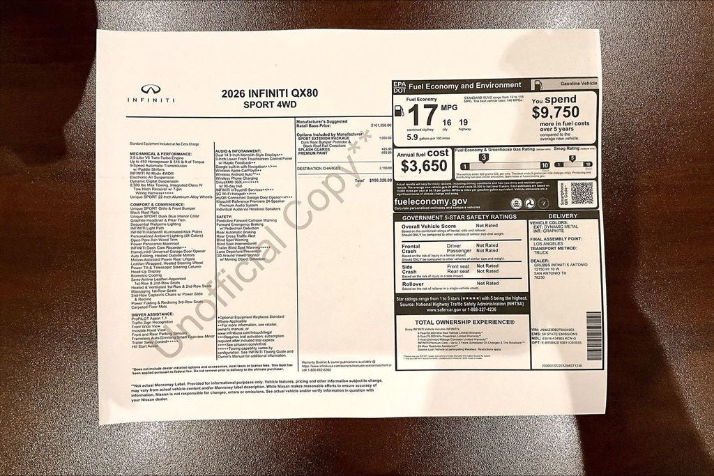 Grubbs INFINITI of San Antonio The only Authorized INFINITI Dealer in San Antonio with the largest New and Pre-Owned INFINITI Selection in the area. This 2026 INFINITI QX80 SPORT comes with 3 Year INFINITI Recommended Maintenance Included at no charge and is loaded with the following Factory Options: Sport Exterior Package (Black Roof Rail Crossbars and Dark Chrome Rear Bumper Protector), 3rd row seats: bench, 4-Wheel Disc Brakes, ABS brakes, Adaptive suspension, Air Conditioning, Alloy wheels, AM/FM radio: SiriusXM with 360L, Anti-whiplash front head restraints, Apple CarPlay/Android Auto, Audio memory, Auto High-beam Headlights, Auto tilt-away steering wheel, Auto-dimming door mirrors, Auto-dimming Rear-View mirror, Auto-leveling suspension, Automatic temperature control, Brake assist, Compass, Delay-off headlights, Driver door bin, Driver vanity mirror, Dual front impact airbags, Dual front side impact airbags, Electronic Stability Control, Emergency communication system: INFINITI InTouch, Four wheel independent suspension, Front anti-roll bar, Front Bucket Seats, Front Center Armrest, Front dual zone A/C, Front reading lights, Fully automatic headlights, Garage door transmitter: HomeLink, Genuine wood dashboard insert, Genuine wood door panel insert, Heads-Up Display, Heated and Climate Controlled Front Bucket Seats with Massage, Heated door mirrors, Heated front seats, Heated rear seats, Heated steering wheel, HVAC memory, Illuminated entry, Knee airbag, Leather steering wheel, Low tire pressure warning, Memory seat, Navigation system: Google Built-in, Occupant sensing airbag, Outside temperature display, Overhead airbag, Overhead console, Panic alarm, Passenger door bin, Passenger vanity mirror, Power door mirrors, Power driver seat, Power Liftgate, Power moonroof, Power passenger seat, Power steering, Power windows, Radio data system, Radio: Klipsch Premiere Audio System, Rain sensing wipers, Rear air conditioning, Rear anti-roll bar, Rear reading lights, Rear seat center armrest, Rear window defroster, Rear window wiper, Reclining 3rd row seat, Remote keyless entry, Security system, Speed control, Speed-sensing steering, Splash Guards, Split folding rear seat, Spoiler, Steering wheel memory, Steering wheel mounted audio controls, Tachometer, Telescoping steering wheel, Tilt steering wheel, Traction control, Trip computer, Turn signal indicator mirrors, Unique SPORT Semi-Aniline Leather Seating Surfaces, Variably intermittent wipers, Ventilated front seats, Ventilated rear seats, and Wheels: 22 x 8.5J Unique SPORT Alloy!! Priced below KBB Fair Purchase Price!