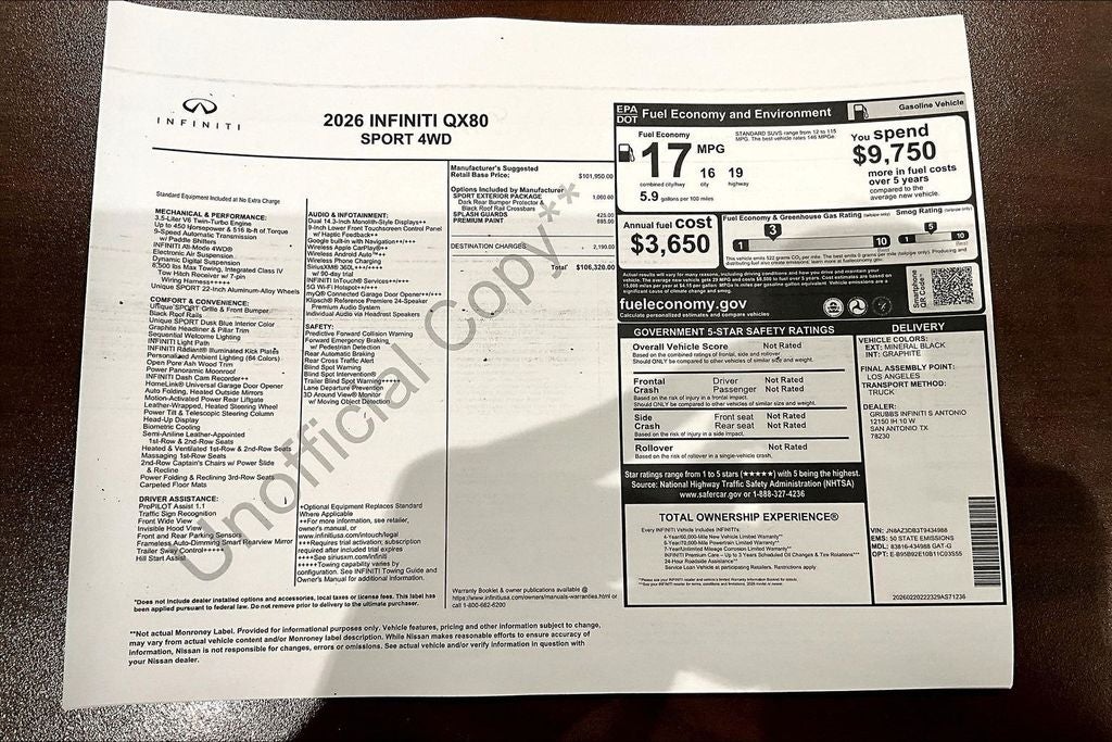 Grubbs INFINITI of San Antonio The only Authorized INFINITI Dealer in San Antonio with the largest New and Pre-Owned INFINITI Selection in the area. This 2026 INFINITI QX80 SPORT comes with 3 Year INFINITI Recommended Maintenance Included at no charge and is loaded with the following Factory Options: Sport Exterior Package (Black Roof Rail Crossbars and Dark Chrome Rear Bumper Protector), 3rd row seats: bench, 4-Wheel Disc Brakes, ABS brakes, Adaptive suspension, Air Conditioning, Alloy wheels, AM/FM radio: SiriusXM with 360L, Anti-whiplash front head restraints, Apple CarPlay/Android Auto, Audio memory, Auto High-beam Headlights, Auto tilt-away steering wheel, Auto-dimming door mirrors, Auto-dimming Rear-View mirror, Auto-leveling suspension, Automatic temperature control, Brake assist, Compass, Delay-off headlights, Driver door bin, Driver vanity mirror, Dual front impact airbags, Dual front side impact airbags, Electronic Stability Control, Emergency communication system: INFINITI InTouch, Four wheel independent suspension, Front anti-roll bar, Front Bucket Seats, Front Center Armrest, Front dual zone A/C, Front reading lights, Fully automatic headlights, Garage door transmitter: HomeLink, Genuine wood dashboard insert, Genuine wood door panel insert, Heads-Up Display, Heated and Climate Controlled Front Bucket Seats with Massage, Heated door mirrors, Heated front seats, Heated rear seats, Heated steering wheel, HVAC memory, Illuminated entry, Knee airbag, Leather steering wheel, Low tire pressure warning, Memory seat, Navigation system: Google Built-in, Occupant sensing airbag, Outside temperature display, Overhead airbag, Overhead console, Panic alarm, Passenger door bin, Passenger vanity mirror, Power door mirrors, Power driver seat, Power Liftgate, Power moonroof, Power passenger seat, Power steering, Power windows, Radio data system, Radio: Klipsch Premiere Audio System, Rain sensing wipers, Rear air conditioning, Rear anti-roll bar, Rear reading lights, Rear seat center armrest, Rear window defroster, Rear window wiper, Reclining 3rd row seat, Remote keyless entry, Security system, Speed control, Speed-sensing steering, Splash Guards, Split folding rear seat, Spoiler, Steering wheel memory, Steering wheel mounted audio controls, Tachometer, Telescoping steering wheel, Tilt steering wheel, Traction control, Trip computer, Turn signal indicator mirrors, Unique SPORT Semi-Aniline Leather Seating Surfaces, Variably intermittent wipers, Ventilated front seats, Ventilated rear seats, and Wheels: 22 x 8.5J Unique SPORT Alloy!! Priced below KBB Fair Purchase Price!