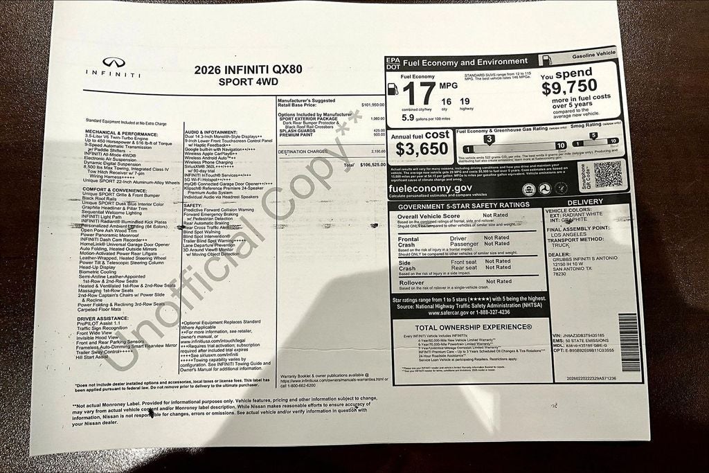 Grubbs INFINITI of San Antonio The only Authorized INFINITI Dealer in San Antonio with the largest New and Pre-Owned INFINITI Selection in the area. This 2026 INFINITI QX80 SPORT comes with 3 Year INFINITI Recommended Maintenance Included at no charge and is loaded with the following Factory Options: Sport Exterior Package (Black Roof Rail Crossbars and Dark Chrome Rear Bumper Protector), 3rd row seats: bench, 4-Wheel Disc Brakes, ABS brakes, Adaptive suspension, Air Conditioning, Alloy wheels, AM/FM radio: SiriusXM with 360L, Anti-whiplash front head restraints, Apple CarPlay/Android Auto, Audio memory, Auto High-beam Headlights, Auto tilt-away steering wheel, Auto-dimming door mirrors, Auto-dimming Rear-View mirror, Auto-leveling suspension, Automatic temperature control, Brake assist, Compass, Delay-off headlights, Driver door bin, Driver vanity mirror, Dual front impact airbags, Dual front side impact airbags, Electronic Stability Control, Emergency communication system: INFINITI InTouch, Four wheel independent suspension, Front anti-roll bar, Front Bucket Seats, Front Center Armrest, Front dual zone A/C, Front reading lights, Fully automatic headlights, Garage door transmitter: HomeLink, Genuine wood dashboard insert, Genuine wood door panel insert, Heads-Up Display, Heated and Climate Controlled Front Bucket Seats with Massage, Heated door mirrors, Heated front seats, Heated rear seats, Heated steering wheel, HVAC memory, Illuminated entry, Knee airbag, Leather steering wheel, Low tire pressure warning, Memory seat, Navigation system: Google Built-in, Occupant sensing airbag, Outside temperature display, Overhead airbag, Overhead console, Panic alarm, Passenger door bin, Passenger vanity mirror, Power door mirrors, Power driver seat, Power Liftgate, Power moonroof, Power passenger seat, Power steering, Power windows, Radio data system, Radio: Klipsch Premiere Audio System, Rain sensing wipers, Rear air conditioning, Rear anti-roll bar, Rear reading lights, Rear seat center armrest, Rear window defroster, Rear window wiper, Reclining 3rd row seat, Remote keyless entry, Security system, Speed control, Speed-sensing steering, Splash Guards, Split folding rear seat, Spoiler, Steering wheel memory, Steering wheel mounted audio controls, Super Premium Paint, Tachometer, Telescoping steering wheel, Tilt steering wheel, Traction control, Trip computer, Turn signal indicator mirrors, Unique SPORT Semi-Aniline Leather Seating Surfaces, Variably intermittent wipers, Ventilated front seats, Ventilated rear seats, and Wheels: 22 x 8.5J Unique SPORT Alloy!! Priced below KBB Fair Purchase Price!