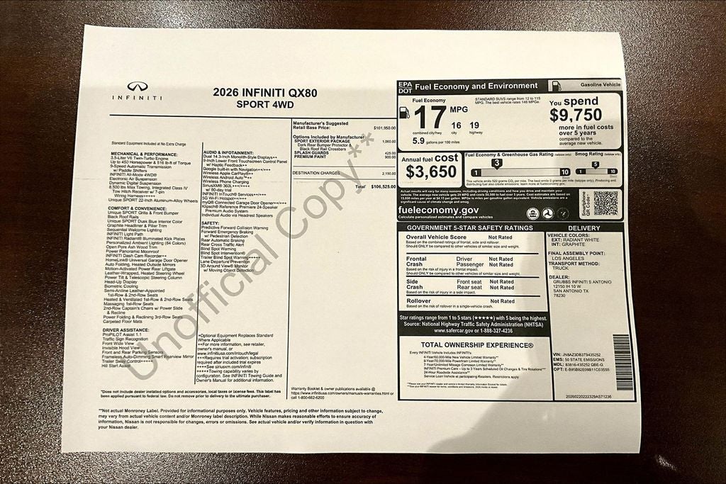 Grubbs INFINITI of San Antonio The only Authorized INFINITI Dealer in San Antonio with the largest New and Pre-Owned INFINITI Selection in the area. This 2026 INFINITI QX80 SPORT comes with 3 Year INFINITI Recommended Maintenance Included at no charge and is loaded with the following Factory Options: Sport Exterior Package (Black Roof Rail Crossbars and Dark Chrome Rear Bumper Protector), 3rd row seats: bench, 4-Wheel Disc Brakes, ABS brakes, Adaptive suspension, Air Conditioning, Alloy wheels, AM/FM radio: SiriusXM with 360L, Anti-whiplash front head restraints, Apple CarPlay/Android Auto, Audio memory, Auto High-beam Headlights, Auto tilt-away steering wheel, Auto-dimming door mirrors, Auto-dimming Rear-View mirror, Auto-leveling suspension, Automatic temperature control, Brake assist, Compass, Delay-off headlights, Driver door bin, Driver vanity mirror, Dual front impact airbags, Dual front side impact airbags, Electronic Stability Control, Emergency communication system: INFINITI InTouch, Four wheel independent suspension, Front anti-roll bar, Front Bucket Seats, Front Center Armrest, Front dual zone A/C, Front reading lights, Fully automatic headlights, Garage door transmitter: HomeLink, Genuine wood dashboard insert, Genuine wood door panel insert, Heads-Up Display, Heated and Climate Controlled Front Bucket Seats with Massage, Heated door mirrors, Heated front seats, Heated rear seats, Heated steering wheel, HVAC memory, Illuminated entry, Knee airbag, Leather steering wheel, Low tire pressure warning, Memory seat, Navigation system: Google Built-in, Occupant sensing airbag, Outside temperature display, Overhead airbag, Overhead console, Panic alarm, Passenger door bin, Passenger vanity mirror, Power door mirrors, Power driver seat, Power Liftgate, Power moonroof, Power passenger seat, Power steering, Power windows, Radio data system, Radio: Klipsch Premiere Audio System, Rain sensing wipers, Rear air conditioning, Rear anti-roll bar, Rear reading lights, Rear seat center armrest, Rear window defroster, Rear window wiper, Reclining 3rd row seat, Remote keyless entry, Security system, Speed control, Speed-sensing steering, Splash Guards, Split folding rear seat, Spoiler, Steering wheel memory, Steering wheel mounted audio controls, Super Premium Paint, Tachometer, Telescoping steering wheel, Tilt steering wheel, Traction control, Trip computer, Turn signal indicator mirrors, Unique SPORT Semi-Aniline Leather Seating Surfaces, Variably intermittent wipers, Ventilated front seats, Ventilated rear seats, and Wheels: 22 x 8.5J Unique SPORT Alloy!! Priced below KBB Fair Purchase Price!