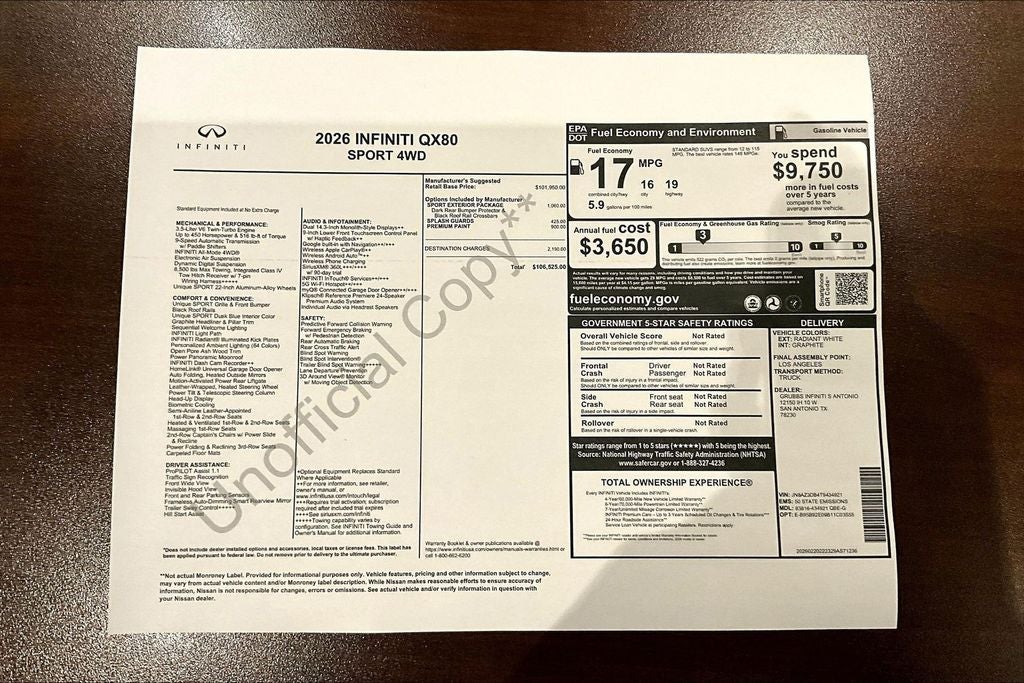 Grubbs INFINITI of San Antonio The only Authorized INFINITI Dealer in San Antonio with the largest New and Pre-Owned INFINITI Selection in the area. This 2026 INFINITI QX80 SPORT comes with 3 Year INFINITI Recommended Maintenance Included at no charge and is loaded with the following Factory Options: Sport Exterior Package (Black Roof Rail Crossbars and Dark Chrome Rear Bumper Protector), 3rd row seats: bench, 4-Wheel Disc Brakes, ABS brakes, Adaptive suspension, Air Conditioning, Alloy wheels, AM/FM radio: SiriusXM with 360L, Anti-whiplash front head restraints, Apple CarPlay/Android Auto, Audio memory, Auto High-beam Headlights, Auto tilt-away steering wheel, Auto-dimming door mirrors, Auto-dimming Rear-View mirror, Auto-leveling suspension, Automatic temperature control, Brake assist, Compass, Delay-off headlights, Driver door bin, Driver vanity mirror, Dual front impact airbags, Dual front side impact airbags, Electronic Stability Control, Emergency communication system: INFINITI InTouch, Four wheel independent suspension, Front anti-roll bar, Front Bucket Seats, Front Center Armrest, Front dual zone A/C, Front reading lights, Fully automatic headlights, Garage door transmitter: HomeLink, Genuine wood dashboard insert, Genuine wood door panel insert, Heads-Up Display, Heated and Climate Controlled Front Bucket Seats with Massage, Heated door mirrors, Heated front seats, Heated rear seats, Heated steering wheel, HVAC memory, Illuminated entry, Knee airbag, Leather steering wheel, Low tire pressure warning, Memory seat, Navigation system: Google Built-in, Occupant sensing airbag, Outside temperature display, Overhead airbag, Overhead console, Panic alarm, Passenger door bin, Passenger vanity mirror, Power door mirrors, Power driver seat, Power Liftgate, Power moonroof, Power passenger seat, Power steering, Power windows, Radio data system, Radio: Klipsch Premiere Audio System, Rain sensing wipers, Rear air conditioning, Rear anti-roll bar, Rear reading lights, Rear seat center armrest, Rear window defroster, Rear window wiper, Reclining 3rd row seat, Remote keyless entry, Security system, Speed control, Speed-sensing steering, Splash Guards, Split folding rear seat, Spoiler, Steering wheel memory, Steering wheel mounted audio controls, Super Premium Paint, Tachometer, Telescoping steering wheel, Tilt steering wheel, Traction control, Trip computer, Turn signal indicator mirrors, Unique SPORT Semi-Aniline Leather Seating Surfaces, Variably intermittent wipers, Ventilated front seats, Ventilated rear seats, and Wheels: 22 x 8.5J Unique SPORT Alloy!! Priced below KBB Fair Purchase Price!