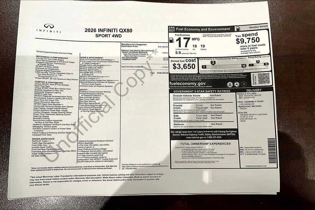 Grubbs INFINITI of San Antonio The only Authorized INFINITI Dealer in San Antonio with the largest New and Pre-Owned INFINITI Selection in the area. This 2026 INFINITI QX80 SPORT comes with 3 Year INFINITI Recommended Maintenance Included at no charge and is loaded with the following Factory Options: Sport Exterior Package (Black Roof Rail Crossbars and Dark Chrome Rear Bumper Protector), 3rd row seats: bench, 4-Wheel Disc Brakes, ABS brakes, Adaptive suspension, Air Conditioning, Alloy wheels, AM/FM radio: SiriusXM with 360L, Anti-whiplash front head restraints, Apple CarPlay/Android Auto, Audio memory, Auto High-beam Headlights, Auto tilt-away steering wheel, Auto-dimming door mirrors, Auto-dimming Rear-View mirror, Auto-leveling suspension, Automatic temperature control, Brake assist, Compass, Delay-off headlights, Driver door bin, Driver vanity mirror, Dual front impact airbags, Dual front side impact airbags, Electronic Stability Control, Emergency communication system: INFINITI InTouch, Four wheel independent suspension, Front anti-roll bar, Front Bucket Seats, Front Center Armrest, Front dual zone A/C, Front reading lights, Fully automatic headlights, Garage door transmitter: HomeLink, Genuine wood dashboard insert, Genuine wood door panel insert, Heads-Up Display, Heated and Climate Controlled Front Bucket Seats with Massage, Heated door mirrors, Heated front seats, Heated rear seats, Heated steering wheel, HVAC memory, Illuminated entry, Knee airbag, Leather steering wheel, Low tire pressure warning, Memory seat, Navigation system: Google Built-in, Occupant sensing airbag, Outside temperature display, Overhead airbag, Overhead console, Panic alarm, Passenger door bin, Passenger vanity mirror, Power door mirrors, Power driver seat, Power Liftgate, Power moonroof, Power passenger seat, Power steering, Power windows, Radio data system, Radio: Klipsch Premiere Audio System, Rain sensing wipers, Rear air conditioning, Rear anti-roll bar, Rear reading lights, Rear seat center armrest, Rear window defroster, Rear window wiper, Reclining 3rd row seat, Remote keyless entry, Security system, Speed control, Speed-sensing steering, Splash Guards, Split folding rear seat, Spoiler, Steering wheel memory, Steering wheel mounted audio controls, Super Premium Paint, Tachometer, Telescoping steering wheel, Tilt steering wheel, Traction control, Trip computer, Turn signal indicator mirrors, Unique SPORT Semi-Aniline Leather Seating Surfaces, Variably intermittent wipers, Ventilated front seats, Ventilated rear seats, and Wheels: 22 x 8.5J Unique SPORT Alloy!! Priced below KBB Fair Purchase Price!