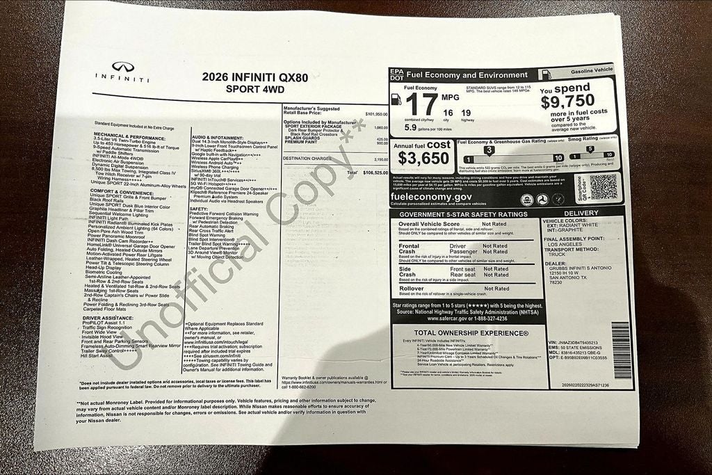 Grubbs INFINITI of San Antonio The only Authorized INFINITI Dealer in San Antonio with the largest New and Pre-Owned INFINITI Selection in the area. This 2026 INFINITI QX80 SPORT comes with 3 Year INFINITI Recommended Maintenance Included at no charge and is loaded with the following Factory Options: Sport Exterior Package (Black Roof Rail Crossbars and Dark Chrome Rear Bumper Protector), 3rd row seats: bench, 4-Wheel Disc Brakes, ABS brakes, Adaptive suspension, Air Conditioning, Alloy wheels, AM/FM radio: SiriusXM with 360L, Anti-whiplash front head restraints, Apple CarPlay/Android Auto, Audio memory, Auto High-beam Headlights, Auto tilt-away steering wheel, Auto-dimming door mirrors, Auto-dimming Rear-View mirror, Auto-leveling suspension, Automatic temperature control, Brake assist, Compass, Delay-off headlights, Driver door bin, Driver vanity mirror, Dual front impact airbags, Dual front side impact airbags, Electronic Stability Control, Emergency communication system: INFINITI InTouch, Four wheel independent suspension, Front anti-roll bar, Front Bucket Seats, Front Center Armrest, Front dual zone A/C, Front reading lights, Fully automatic headlights, Garage door transmitter: HomeLink, Genuine wood dashboard insert, Genuine wood door panel insert, Heads-Up Display, Heated and Climate Controlled Front Bucket Seats with Massage, Heated door mirrors, Heated front seats, Heated rear seats, Heated steering wheel, HVAC memory, Illuminated entry, Knee airbag, Leather steering wheel, Low tire pressure warning, Memory seat, Navigation system: Google Built-in, Occupant sensing airbag, Outside temperature display, Overhead airbag, Overhead console, Panic alarm, Passenger door bin, Passenger vanity mirror, Power door mirrors, Power driver seat, Power Liftgate, Power moonroof, Power passenger seat, Power steering, Power windows, Radio data system, Radio: Klipsch Premiere Audio System, Rain sensing wipers, Rear air conditioning, Rear anti-roll bar, Rear reading lights, Rear seat center armrest, Rear window defroster, Rear window wiper, Reclining 3rd row seat, Remote keyless entry, Security system, Speed control, Speed-sensing steering, Splash Guards, Split folding rear seat, Spoiler, Steering wheel memory, Steering wheel mounted audio controls, Super Premium Paint, Tachometer, Telescoping steering wheel, Tilt steering wheel, Traction control, Trip computer, Turn signal indicator mirrors, Unique SPORT Semi-Aniline Leather Seating Surfaces, Variably intermittent wipers, Ventilated front seats, Ventilated rear seats, and Wheels: 22 x 8.5J Unique SPORT Alloy!! Priced below KBB Fair Purchase Price!