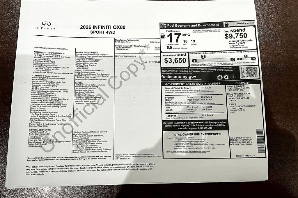 Grubbs INFINITI of San Antonio The only Authorized INFINITI Dealer in San Antonio with the largest New and Pre-Owned INFINITI Selection in the area. This 2026 INFINITI QX80 SPORT comes with 3 Year INFINITI Recommended Maintenance Included at no charge and is loaded with the following Factory Options: Sport Exterior Package (Black Roof Rail Crossbars and Dark Chrome Rear Bumper Protector), 3rd row seats: bench, 4-Wheel Disc Brakes, ABS brakes, Adaptive suspension, Air Conditioning, Alloy wheels, AM/FM radio: SiriusXM with 360L, Anti-whiplash front head restraints, Apple CarPlay/Android Auto, Audio memory, Auto High-beam Headlights, Auto tilt-away steering wheel, Auto-dimming door mirrors, Auto-dimming Rear-View mirror, Auto-leveling suspension, Automatic temperature control, Brake assist, Compass, Delay-off headlights, Driver door bin, Driver vanity mirror, Dual front impact airbags, Dual front side impact airbags, Electronic Stability Control, Emergency communication system: INFINITI InTouch, Four wheel independent suspension, Front anti-roll bar, Front Bucket Seats, Front Center Armrest, Front dual zone A/C, Front reading lights, Fully automatic headlights, Garage door transmitter: HomeLink, Genuine wood dashboard insert, Genuine wood door panel insert, Heads-Up Display, Heated and Climate Controlled Front Bucket Seats with Massage, Heated door mirrors, Heated front seats, Heated rear seats, Heated steering wheel, HVAC memory, Illuminated entry, Knee airbag, Leather steering wheel, Low tire pressure warning, Memory seat, Navigation system: Google Built-in, Occupant sensing airbag, Outside temperature display, Overhead airbag, Overhead console, Panic alarm, Passenger door bin, Passenger vanity mirror, Power door mirrors, Power driver seat, Power Liftgate, Power moonroof, Power passenger seat, Power steering, Power windows, Radio data system, Radio: Klipsch Premiere Audio System, Rain sensing wipers, Rear air conditioning, Rear anti-roll bar, Rear reading lights, Rear seat center armrest, Rear window defroster, Rear window wiper, Reclining 3rd row seat, Remote keyless entry, Security system, Speed control, Speed-sensing steering, Splash Guards, Split folding rear seat, Spoiler, Steering wheel memory, Steering wheel mounted audio controls, Super Premium Paint, Tachometer, Telescoping steering wheel, Tilt steering wheel, Traction control, Trip computer, Turn signal indicator mirrors, Unique SPORT Semi-Aniline Leather Seating Surfaces, Variably intermittent wipers, Ventilated front seats, Ventilated rear seats, and Wheels: 22 x 8.5J Unique SPORT Alloy!! Priced below KBB Fair Purchase Price!