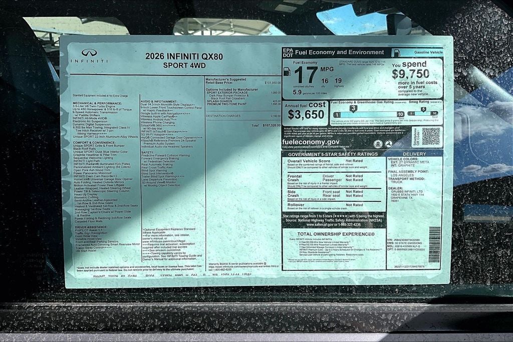Grubbs INFINITI – The Only Authorized INFINITI Dealer in Grapevine Proudly serving drivers across the U.S. Since 1948! Explore one of the largest selections of New and Pre-Owned INFINITI vehicles in the area — all backed by our commitment to excellence and exceptional customer service. Every New Grubbs INFINITI comes with: Our Exclusive Lifetime Powertrain Warranty 3 Years of INFINITI-Recommended Maintenance – Included, with No Charge Valet Service when servicing your vehicle with pick up and drop at work or home and Hassle-Free Nationwide Shipping is Available. This 2026 INFINITI QX80 SPORT in Dynamic Metal/Black Obsidian with Premium Graphite interior is equipped with the following high value Features Sport Exterior Package (Black Roof Rail Crossbars and Dark Chrome Rear Bumper Protector), 3rd row seats: bench, 4-Wheel Disc Brakes, ABS brakes, Adaptive suspension, Air Conditioning, AM/FM radio: SiriusXM with 360L, Anti-whiplash front head restraints, Apple CarPlay/Android Auto, Audio memory, Auto High-beam Headlights, Auto tilt-away steering wheel, Auto-dimming door mirrors, Auto-dimming Rear-View mirror, Auto-leveling suspension, Automatic temperature control, Brake assist, Compass, Delay-off headlights, Driver door bin, Driver vanity mirror, Dual front impact airbags, Dual front side impact airbags, Electronic Stability Control, Emergency communication system: INFINITI InTouch, Four wheel independent suspension, Front anti-roll bar, Front Bucket Seats, Front Center Armrest, Front dual zone A/C, Fully automatic headlights, Garage door transmitter: HomeLink, Genuine wood dashboard insert, Genuine wood door panel insert, Heads-Up Display, Heated and Climate Controlled Front Bucket Seats with Massage, Heated door mirrors, Heated front seats, Heated rear seats, Heated steering wheel, HVAC memory, Illuminated entry, Knee airbag, Leather steering wheel, Low tire pressure warning, Memory seat, Navigation system: Google Built-in, Occupant sensing airbag, Outside temperature display, Overhead airbag, Overhead console, Panic alarm, Passenger vanity mirror, Power door mirrors, Power driver seat, Power Liftgate, Power moonroof, Power passenger seat, Power steering, Power windows, Radio data system, Radio: Klipsch Premiere Audio System, Rain sensing wipers, Rear air conditioning, Rear anti-roll bar, Rear reading lights, Rear seat center armrest, Rear window defroster, Rear window wiper, Reclining 3rd row seat, Remote keyless entry, Security system, Speed control, Speed-sensing steering, Splash Guards, Split folding rear seat, Spoiler, Steering wheel memory, Steering wheel mounted audio controls, Tachometer, Telescoping steering wheel, Tilt steering wheel, Traction control, Trip computer, Turn signal indicator mirrors, Two-Tone Premium Paint, Unique SPORT Semi-Aniline Leather Seating Surfaces, Variably intermittent wipers, Ventilated front seats, Ventilated rear seats, and Wheels: 22 x 8.5J Unique SPORT Alloy.