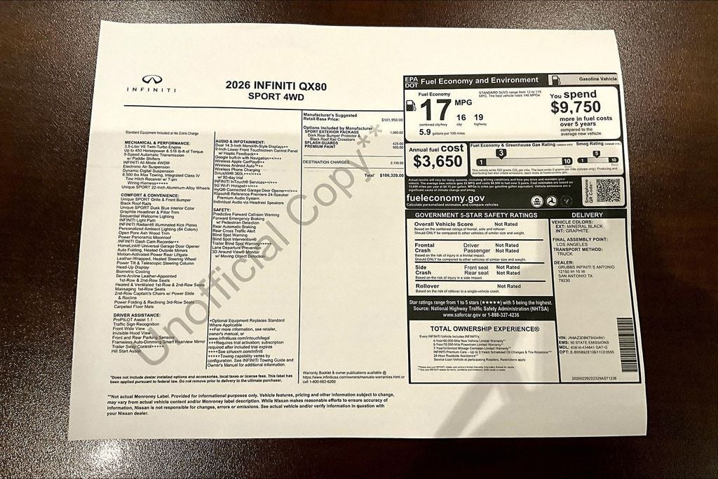 Grubbs INFINITI of San Antonio The only Authorized INFINITI Dealer in San Antonio with the largest New and Pre-Owned INFINITI Selection in the area. This 2026 INFINITI QX80 SPORT comes with 3 Year INFINITI Recommended Maintenance Included at no charge and is loaded with the following Factory Options: Sport Exterior Package (Black Roof Rail Crossbars and Dark Chrome Rear Bumper Protector), 3rd row seats: bench, 4-Wheel Disc Brakes, ABS brakes, Adaptive suspension, Air Conditioning, Alloy wheels, AM/FM radio: SiriusXM with 360L, Anti-whiplash front head restraints, Apple CarPlay/Android Auto, Audio memory, Auto High-beam Headlights, Auto tilt-away steering wheel, Auto-dimming door mirrors, Auto-dimming Rear-View mirror, Auto-leveling suspension, Automatic temperature control, Brake assist, Compass, Delay-off headlights, Driver door bin, Driver vanity mirror, Dual front impact airbags, Dual front side impact airbags, Electronic Stability Control, Emergency communication system: INFINITI InTouch, Four wheel independent suspension, Front anti-roll bar, Front Bucket Seats, Front Center Armrest, Front dual zone A/C, Front reading lights, Fully automatic headlights, Garage door transmitter: HomeLink, Genuine wood dashboard insert, Genuine wood door panel insert, Heads-Up Display, Heated and Climate Controlled Front Bucket Seats with Massage, Heated door mirrors, Heated front seats, Heated rear seats, Heated steering wheel, HVAC memory, Illuminated entry, Knee airbag, Leather steering wheel, Low tire pressure warning, Memory seat, Navigation system: Google Built-in, Occupant sensing airbag, Outside temperature display, Overhead airbag, Overhead console, Panic alarm, Passenger door bin, Passenger vanity mirror, Power door mirrors, Power driver seat, Power Liftgate, Power moonroof, Power passenger seat, Power steering, Power windows, Radio data system, Radio: Klipsch Premiere Audio System, Rain sensing wipers, Rear air conditioning, Rear anti-roll bar, Rear reading lights, Rear seat center armrest, Rear window defroster, Rear window wiper, Reclining 3rd row seat, Remote keyless entry, Security system, Speed control, Speed-sensing steering, Splash Guards, Split folding rear seat, Spoiler, Steering wheel memory, Steering wheel mounted audio controls, Tachometer, Telescoping steering wheel, Tilt steering wheel, Traction control, Trip computer, Turn signal indicator mirrors, Unique SPORT Semi-Aniline Leather Seating Surfaces, Variably intermittent wipers, Ventilated front seats, Ventilated rear seats, and Wheels: 22 x 8.5J Unique SPORT Alloy!! Priced below KBB Fair Purchase Price!