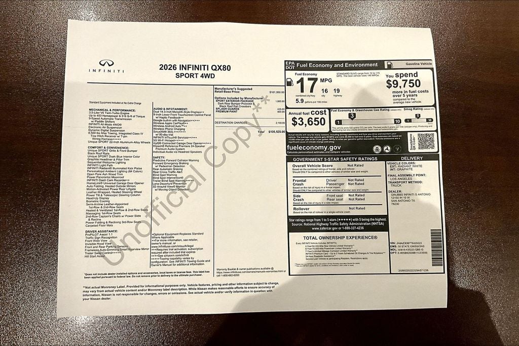 Grubbs INFINITI of San Antonio The only Authorized INFINITI Dealer in San Antonio with the largest New and Pre-Owned INFINITI Selection in the area. This 2026 INFINITI QX80 SPORT comes with 3 Year INFINITI Recommended Maintenance Included at no charge and is loaded with the following Factory Options: Sport Exterior Package (Black Roof Rail Crossbars and Dark Chrome Rear Bumper Protector), 3rd row seats: bench, 4-Wheel Disc Brakes, ABS brakes, Adaptive suspension, Air Conditioning, Alloy wheels, AM/FM radio: SiriusXM with 360L, Anti-whiplash front head restraints, Apple CarPlay/Android Auto, Audio memory, Auto High-beam Headlights, Auto tilt-away steering wheel, Auto-dimming door mirrors, Auto-dimming Rear-View mirror, Auto-leveling suspension, Automatic temperature control, Brake assist, Compass, Delay-off headlights, Driver door bin, Driver vanity mirror, Dual front impact airbags, Dual front side impact airbags, Electronic Stability Control, Emergency communication system: INFINITI InTouch, Four wheel independent suspension, Front anti-roll bar, Front Bucket Seats, Front Center Armrest, Front dual zone A/C, Front reading lights, Fully automatic headlights, Garage door transmitter: HomeLink, Genuine wood dashboard insert, Genuine wood door panel insert, Heads-Up Display, Heated and Climate Controlled Front Bucket Seats with Massage, Heated door mirrors, Heated front seats, Heated rear seats, Heated steering wheel, HVAC memory, Illuminated entry, Knee airbag, Leather steering wheel, Low tire pressure warning, Memory seat, Navigation system: Google Built-in, Occupant sensing airbag, Outside temperature display, Overhead airbag, Overhead console, Panic alarm, Passenger door bin, Passenger vanity mirror, Power door mirrors, Power driver seat, Power Liftgate, Power moonroof, Power passenger seat, Power steering, Power windows, Radio data system, Radio: Klipsch Premiere Audio System, Rain sensing wipers, Rear air conditioning, Rear anti-roll bar, Rear reading lights, Rear seat center armrest, Rear window defroster, Rear window wiper, Reclining 3rd row seat, Remote keyless entry, Security system, Speed control, Speed-sensing steering, Splash Guards, Split folding rear seat, Spoiler, Steering wheel memory, Steering wheel mounted audio controls, Super Premium Paint, Tachometer, Telescoping steering wheel, Tilt steering wheel, Traction control, Trip computer, Turn signal indicator mirrors, Unique SPORT Semi-Aniline Leather Seating Surfaces, Variably intermittent wipers, Ventilated front seats, Ventilated rear seats, and Wheels: 22 x 8.5J Unique SPORT Alloy!! Priced below KBB Fair Purchase Price!