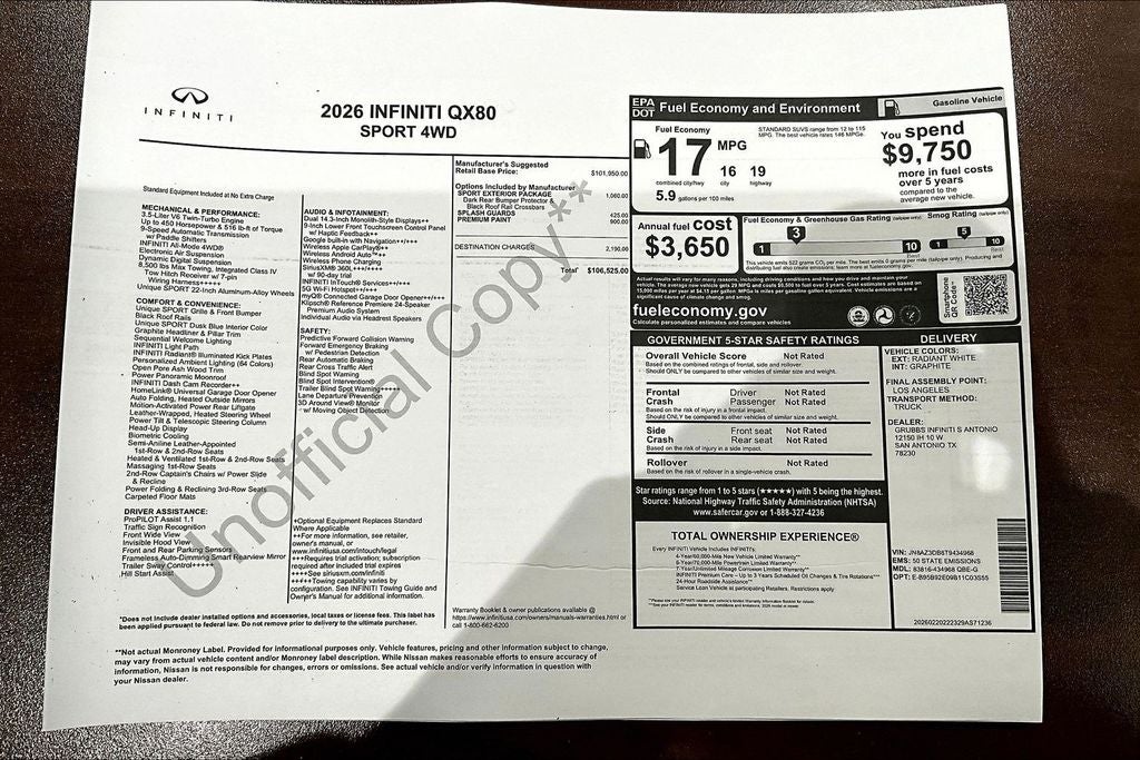 Grubbs INFINITI of San Antonio The only Authorized INFINITI Dealer in San Antonio with the largest New and Pre-Owned INFINITI Selection in the area. This 2026 INFINITI QX80 SPORT comes with 3 Year INFINITI Recommended Maintenance Included at no charge and is loaded with the following Factory Options: Sport Exterior Package (Black Roof Rail Crossbars and Dark Chrome Rear Bumper Protector), 3rd row seats: bench, 4-Wheel Disc Brakes, ABS brakes, Adaptive suspension, Air Conditioning, Alloy wheels, AM/FM radio: SiriusXM with 360L, Anti-whiplash front head restraints, Apple CarPlay/Android Auto, Audio memory, Auto High-beam Headlights, Auto tilt-away steering wheel, Auto-dimming door mirrors, Auto-dimming Rear-View mirror, Auto-leveling suspension, Automatic temperature control, Brake assist, Compass, Delay-off headlights, Driver door bin, Driver vanity mirror, Dual front impact airbags, Dual front side impact airbags, Electronic Stability Control, Emergency communication system: INFINITI InTouch, Four wheel independent suspension, Front anti-roll bar, Front Bucket Seats, Front Center Armrest, Front dual zone A/C, Front reading lights, Fully automatic headlights, Garage door transmitter: HomeLink, Genuine wood dashboard insert, Genuine wood door panel insert, Heads-Up Display, Heated and Climate Controlled Front Bucket Seats with Massage, Heated door mirrors, Heated front seats, Heated rear seats, Heated steering wheel, HVAC memory, Illuminated entry, Knee airbag, Leather steering wheel, Low tire pressure warning, Memory seat, Navigation system: Google Built-in, Occupant sensing airbag, Outside temperature display, Overhead airbag, Overhead console, Panic alarm, Passenger door bin, Passenger vanity mirror, Power door mirrors, Power driver seat, Power Liftgate, Power moonroof, Power passenger seat, Power steering, Power windows, Radio data system, Radio: Klipsch Premiere Audio System, Rain sensing wipers, Rear air conditioning, Rear anti-roll bar, Rear reading lights, Rear seat center armrest, Rear window defroster, Rear window wiper, Reclining 3rd row seat, Remote keyless entry, Security system, Speed control, Speed-sensing steering, Splash Guards, Split folding rear seat, Spoiler, Steering wheel memory, Steering wheel mounted audio controls, Super Premium Paint, Tachometer, Telescoping steering wheel, Tilt steering wheel, Traction control, Trip computer, Turn signal indicator mirrors, Unique SPORT Semi-Aniline Leather Seating Surfaces, Variably intermittent wipers, Ventilated front seats, Ventilated rear seats, and Wheels: 22 x 8.5J Unique SPORT Alloy!! Priced below KBB Fair Purchase Price!