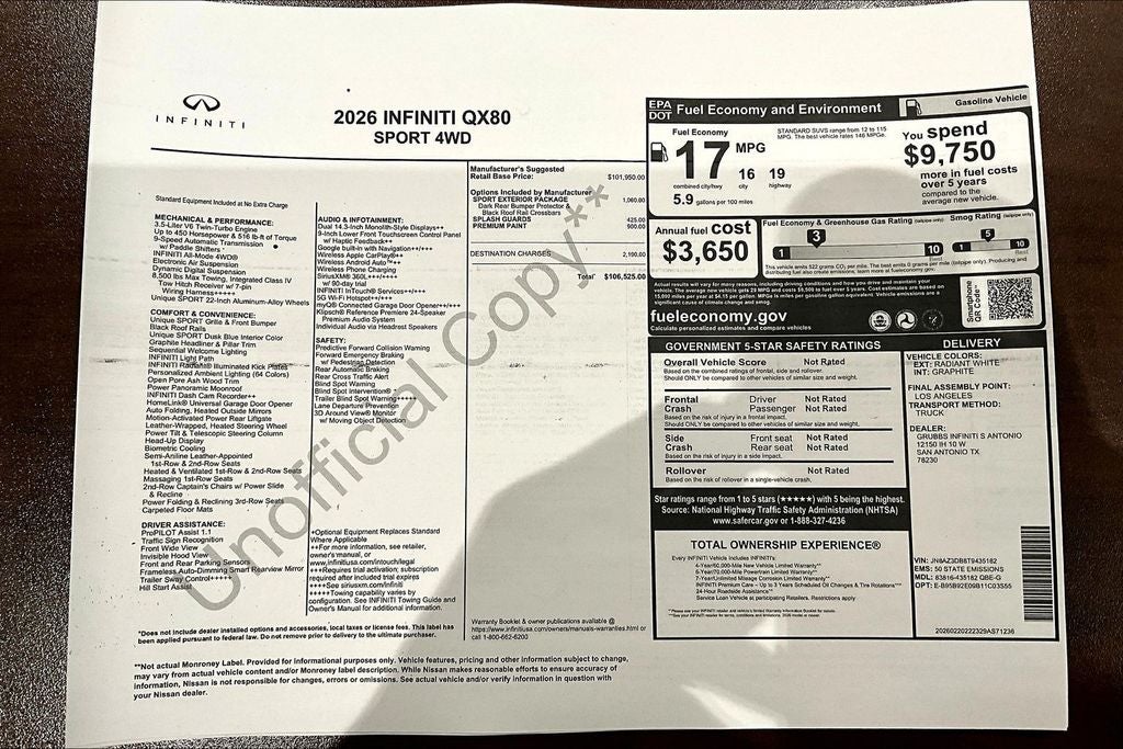 Grubbs INFINITI of San Antonio The only Authorized INFINITI Dealer in San Antonio with the largest New and Pre-Owned INFINITI Selection in the area. This 2026 INFINITI QX80 SPORT comes with 3 Year INFINITI Recommended Maintenance Included at no charge and is loaded with the following Factory Options: Sport Exterior Package (Black Roof Rail Crossbars and Dark Chrome Rear Bumper Protector), 3rd row seats: bench, 4-Wheel Disc Brakes, ABS brakes, Adaptive suspension, Air Conditioning, Alloy wheels, AM/FM radio: SiriusXM with 360L, Anti-whiplash front head restraints, Apple CarPlay/Android Auto, Audio memory, Auto High-beam Headlights, Auto tilt-away steering wheel, Auto-dimming door mirrors, Auto-dimming Rear-View mirror, Auto-leveling suspension, Automatic temperature control, Brake assist, Compass, Delay-off headlights, Driver door bin, Driver vanity mirror, Dual front impact airbags, Dual front side impact airbags, Electronic Stability Control, Emergency communication system: INFINITI InTouch, Four wheel independent suspension, Front anti-roll bar, Front Bucket Seats, Front Center Armrest, Front dual zone A/C, Front reading lights, Fully automatic headlights, Garage door transmitter: HomeLink, Genuine wood dashboard insert, Genuine wood door panel insert, Heads-Up Display, Heated and Climate Controlled Front Bucket Seats with Massage, Heated door mirrors, Heated front seats, Heated rear seats, Heated steering wheel, HVAC memory, Illuminated entry, Knee airbag, Leather steering wheel, Low tire pressure warning, Memory seat, Navigation system: Google Built-in, Occupant sensing airbag, Outside temperature display, Overhead airbag, Overhead console, Panic alarm, Passenger door bin, Passenger vanity mirror, Power door mirrors, Power driver seat, Power Liftgate, Power moonroof, Power passenger seat, Power steering, Power windows, Radio data system, Radio: Klipsch Premiere Audio System, Rain sensing wipers, Rear air conditioning, Rear anti-roll bar, Rear reading lights, Rear seat center armrest, Rear window defroster, Rear window wiper, Reclining 3rd row seat, Remote keyless entry, Security system, Speed control, Speed-sensing steering, Splash Guards, Split folding rear seat, Spoiler, Steering wheel memory, Steering wheel mounted audio controls, Super Premium Paint, Tachometer, Telescoping steering wheel, Tilt steering wheel, Traction control, Trip computer, Turn signal indicator mirrors, Unique SPORT Semi-Aniline Leather Seating Surfaces, Variably intermittent wipers, Ventilated front seats, Ventilated rear seats, and Wheels: 22 x 8.5J Unique SPORT Alloy!! Priced below KBB Fair Purchase Price!