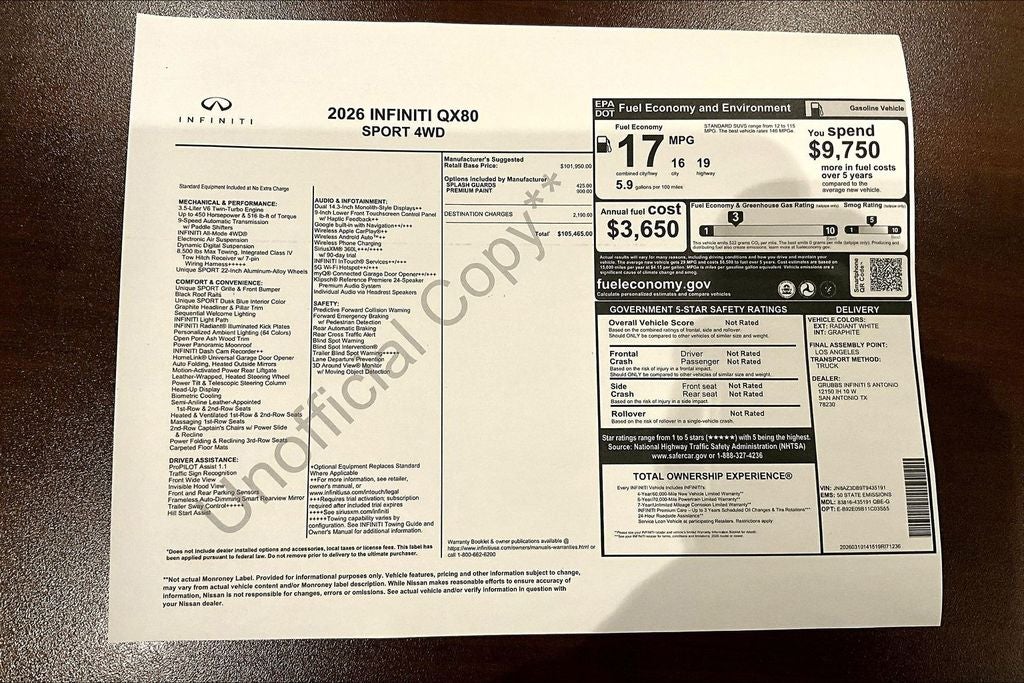 Grubbs INFINITI of San Antonio The only Authorized INFINITI Dealer in San Antonio with the largest New and Pre-Owned INFINITI Selection in the area. This 2026 INFINITI QX80 SPORT comes with 3 Year INFINITI Recommended Maintenance Included at no charge and is loaded with the following Factory Options: Sport Exterior Package (Black Roof Rail Crossbars and Dark Chrome Rear Bumper Protector), 3rd row seats: bench, 4-Wheel Disc Brakes, ABS brakes, Adaptive suspension, Air Conditioning, Alloy wheels, AM/FM radio: SiriusXM with 360L, Anti-whiplash front head restraints, Apple CarPlay/Android Auto, Audio memory, Auto High-beam Headlights, Auto tilt-away steering wheel, Auto-dimming door mirrors, Auto-dimming Rear-View mirror, Auto-leveling suspension, Automatic temperature control, Brake assist, Compass, Delay-off headlights, Driver door bin, Driver vanity mirror, Dual front impact airbags, Dual front side impact airbags, Electronic Stability Control, Emergency communication system: INFINITI InTouch, Four wheel independent suspension, Front anti-roll bar, Front Bucket Seats, Front Center Armrest, Front dual zone A/C, Front reading lights, Fully automatic headlights, Garage door transmitter: HomeLink, Genuine wood dashboard insert, Genuine wood door panel insert, Heads-Up Display, Heated and Climate Controlled Front Bucket Seats with Massage, Heated door mirrors, Heated front seats, Heated rear seats, Heated steering wheel, HVAC memory, Illuminated entry, Knee airbag, Leather steering wheel, Low tire pressure warning, Memory seat, Navigation system: Google Built-in, Occupant sensing airbag, Outside temperature display, Overhead airbag, Overhead console, Panic alarm, Passenger door bin, Passenger vanity mirror, Power door mirrors, Power driver seat, Power Liftgate, Power moonroof, Power passenger seat, Power steering, Power windows, Radio data system, Radio: Klipsch Premiere Audio System, Rain sensing wipers, Rear air conditioning, Rear anti-roll bar, Rear reading lights, Rear seat center armrest, Rear window defroster, Rear window wiper, Reclining 3rd row seat, Remote keyless entry, Security system, Speed control, Speed-sensing steering, Splash Guards, Split folding rear seat, Spoiler, Steering wheel memory, Steering wheel mounted audio controls, Super Premium Paint, Tachometer, Telescoping steering wheel, Tilt steering wheel, Traction control, Trip computer, Turn signal indicator mirrors, Unique SPORT Semi-Aniline Leather Seating Surfaces, Variably intermittent wipers, Ventilated front seats, Ventilated rear seats, and Wheels: 22 x 8.5J Unique SPORT Alloy!! Priced below KBB Fair Purchase Price!