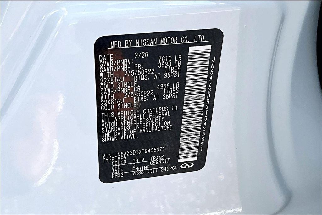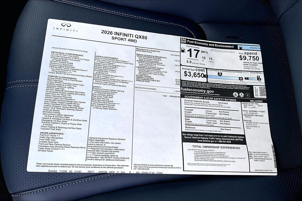 Grubbs INFINITI of San Antonio The only Authorized INFINITI Dealer in San Antonio with the largest New and Pre-Owned INFINITI Selection in the area. This 2026 INFINITI QX80 SPORT comes with 3 Year INFINITI Recommended Maintenance Included at no charge and is loaded with the following Factory Options: Black Interior Lighting Package (INFINITI Radiant Black Cargo Scuff Plates and Panoramic Illuminated Headliner), Premium Cargo Package (Cargo Blocks/Stabilizers, Cargo Shelf/Barrier, Carpeted Cargo Area Protector, and Console Net), Sport Exterior Package (Black Roof Rail Crossbars and Dark Chrome Rear Bumper Protector), 3rd row seats: bench, 4-Wheel Disc Brakes, ABS brakes, Adaptive suspension, Air Conditioning, Alloy wheels, AM/FM radio: SiriusXM with 360L, Anti-whiplash front head restraints, Apple CarPlay/Android Auto, Audio memory, Auto High-beam Headlights, Auto tilt-away steering wheel, Auto-dimming door mirrors, Auto-dimming Rear-View mirror, Auto-leveling suspension, Automatic temperature control, Brake assist, Compass, Delay-off headlights, Driver door bin, Driver vanity mirror, Dual front impact airbags, Dual front side impact airbags, Electronic Stability Control, Emergency communication system: INFINITI InTouch, Four wheel independent suspension, Front anti-roll bar, Front Bucket Seats, Front Center Armrest, Front dual zone A/C, Front reading lights, Fully automatic headlights, Garage door transmitter: HomeLink, Genuine wood dashboard insert, Genuine wood door panel insert, Heads-Up Display, Heated and Climate Controlled Front Bucket Seats with Massage, Heated door mirrors, Heated front seats, Heated rear seats, Heated steering wheel, HVAC memory, Illuminated entry, Knee airbag, Leather steering wheel, Low tire pressure warning, Memory seat, Navigation system: Google Built-in, Occupant sensing airbag, Outside temperature display, Overhead airbag, Overhead console, Panic alarm, Passenger door bin, Passenger vanity mirror, Power door mirrors, Power driver seat, Power Liftgate, Power moonroof, Power passenger seat, Power steering, Power windows, Radio data system, Radio: Klipsch Premiere Audio System, Rain sensing wipers, Rear air conditioning, Rear anti-roll bar, Rear reading lights, Rear seat center armrest, Rear window defroster, Rear window wiper, Reclining 3rd row seat, Remote keyless entry, Security system, Speed control, Speed-sensing steering, Splash Guards, Split folding rear seat, Spoiler, Steering wheel memory, Steering wheel mounted audio controls, Super Premium Paint, Tachometer, Telescoping steering wheel, Tilt steering wheel, Traction control, Trip computer, Turn signal indicator mirrors, Umbrella Holder, Unique SPORT Semi-Aniline Leather Seating Surfaces, USB Charging Cable Set, Variably intermittent wipers, Ventilated front seats, Ventilated rear seats, and Wheels: 22 x 8.5J Unique SPORT Alloy!! Priced below KBB Fair Purchase Price!