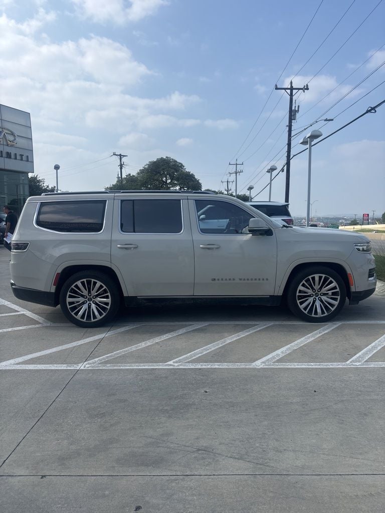 Grubbs INFINITI of San Antonio is pleased to present you with another Market Priced Pre-Owned Vehicle that has gone through our comprehensive 167 point safety inspection. This 2022 Jeep Grand Wagoneer Series III is loaded with the following high value options Flexible Seating Group (2nd Row Dual Charge-Only USB Ports, 40/20/40 Power Recline Tip/Slide, and 8-Passenger Seating), Quick Order Package 23W, Two Tone Paint Group, 3.92 Rear Axle Ratio, 3rd row seats: bench, 4-Wheel Disc Brakes, ABS brakes, Adjustable pedals, Air Conditioning, Alloy wheels, AM/FM radio: SiriusXM with 360L, Anti-whiplash front head restraints, Audio memory, Auto High-beam Headlights, Auto-dimming door mirrors, Auto-dimming Rear-View mirror, Auto-leveling suspension, Automatic temperature control, Body Color Roof, Brake assist, Bumpers: body-color, Compass, Delay-off headlights, Driver door bin, Driver vanity mirror, Driver's Seat Mounted Armrest, Dual front impact airbags, Dual front side impact airbags, Electronic Stability Control, Four wheel independent suspension, Front anti-roll bar, Front Bucket Seats, Front Center Armrest w/Storage, Front dual zone A/C, Front fog lights, Front reading lights, Fully automatic headlights, Garage door transmitter, Genuine wood console insert, Genuine wood dashboard insert, Genuine wood door panel insert, Heads-Up Display, Heated door mirrors, Heated front seats, Heated rear seats, Heated steering wheel, Illuminated entry, Knee airbag, Leather steering wheel, Low tire pressure warning, Memory seat, Navigation System, Night vision lights, Normal Duty Suspension, Occupant sensing airbag, Outside temperature display, Overhead airbag, Overhead console, Panic alarm, Passenger door bin, Passenger seat mounted armrest, Passenger vanity mirror, Pedal memory, Power adjustable front head restraints, Power door mirrors, Power driver seat, Power Liftgate, Power moonroof, Power passenger seat, Power steering, Power windows, Premium Leather Trimmed Bucket Seats, Radio data system, Radio: Uconnect 5 Nav w/12.0 Display, Rain sensing wipers, Rear air conditioning, Rear anti-roll bar, Rear dual zone A/C, Rear reading lights, Rear seat center armrest, Rear window defroster, Rear window wiper, Reclining 3rd row seat, Remote keyless entry, Roof rack, Security system, Speed control, Speed-sensing steering, Speed-Sensitive Wipers, Split folding rear seat, Steering wheel memory, Steering wheel mounted audio controls, Tachometer, Telescoping steering wheel, Tilt steering wheel, Traction control, Trip computer, Turn signal indicator mirrors, Variably intermittent wipers, Ventilated front seats, Ventilated rear seats, Voltmeter, and Wheels: 22 x 9.0 Premium 4 Aluminum. CARFAX One-Owner. Priced below KBB Fair Purchase Price!