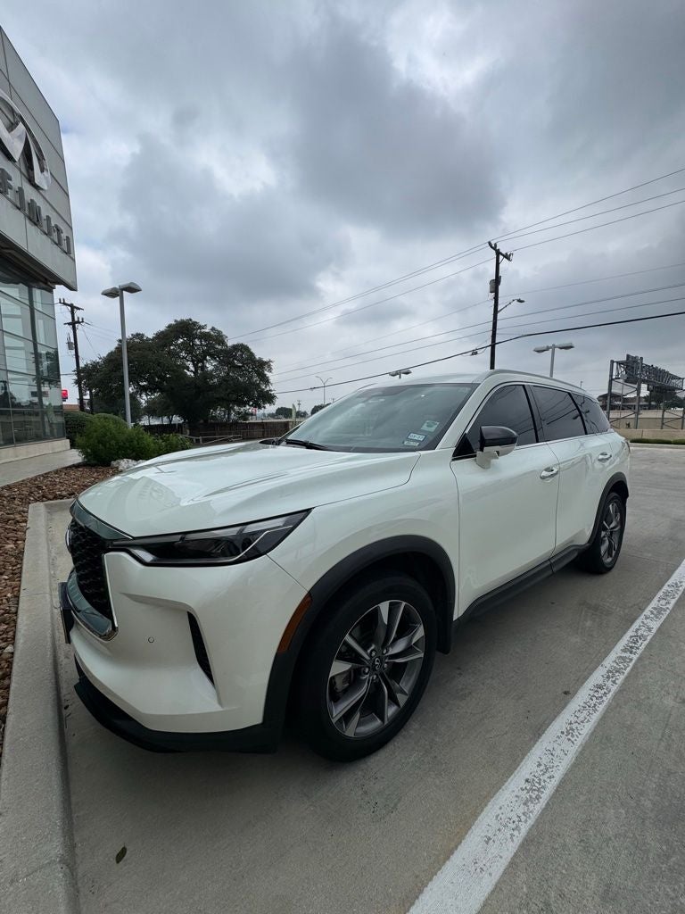 Grubbs INFINITI of San Antonio is pleased to present you with another Market Priced Pre-Owned Vehicle that has gone through our comprehensive 167 point safety inspection. This 2023 INFINITI QX60 LUXE is loaded with the following high value options INFINITI Certified Certified, 3rd row seats: bench, 4-Wheel Disc Brakes, 4.334 Axle Ratio, 9 Speakers, ABS brakes, Air Conditioning, Alloy wheels, AM/FM radio: SiriusXM, Anti-whiplash front head restraints, Auto High-beam Headlights, Auto-dimming door mirrors, Auto-dimming Rear-View mirror, Automatic temperature control, Brake assist, Bumpers: body-color, Climate-Controlled Front Bucket Seats, Delay-off headlights, Driver door bin, Driver vanity mirror, Dual front impact airbags, Dual front side impact airbags, Electronic Stability Control, Emergency communication system, Floor Mats on Bench Seats w/3rd Row Tray, Four wheel independent suspension, Front anti-roll bar, Front Bucket Seats, Front Center Armrest, Front dual zone A/C, Front reading lights, Fully automatic headlights, Garage door transmitter: HomeLink, Heated door mirrors, Heated front seats, Heated steering wheel, Illuminated entry, Knee airbag, Leather Shift Knob, Leather steering wheel, Leather-Appointed Seating Surfaces, Literature Kit, Low tire pressure warning, Memory seat, Navigation system: INFINITI InTouch Navigation, Occupant sensing airbag, Outside temperature display, Overhead airbag, Overhead console, Panic alarm, Passenger door bin, Passenger vanity mirror, Power door mirrors, Power driver seat, Power Liftgate, Power moonroof, Power passenger seat, Power steering, Power windows, Radio data system, Radio: AM/FM Audio System, Rain sensing wipers, Rear air conditioning, Rear anti-roll bar, Rear reading lights, Rear seat center armrest, Rear side impact airbag, Rear window defroster, Rear window wiper, Reclining 3rd row seat, Remote keyless entry, Security system, Speed control, Speed-sensing steering, Speed-Sensitive Wipers, Splash Guards, Split folding rear seat, Spoiler, Steering wheel memory, Steering wheel mounted audio controls, Tachometer, Telescoping steering wheel, Tilt steering wheel, Traction control, Trip computer, Turn signal indicator mirrors, Variably intermittent wipers, Ventilated front seats, and Wheels: 20 x 8J Sporty Machined Aluminum Alloy. Clean CARFAX.