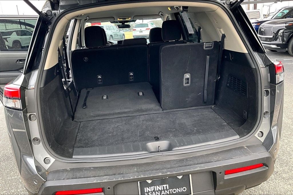 Grubbs INFINITI of San Antonio is pleased to present you with another Market Priced Pre-Owned Vehicle that has gone through our comprehensive 167 point safety inspection. This 2024 Nissan Pathfinder S is loaded with the following high value options 4WD, 3rd row seats: bench, 4-Wheel Disc Brakes, 6 Speakers, ABS brakes, Air Conditioning, Alloy wheels, AM/FM radio: SiriusXM, Auto High-beam Headlights, Automatic temperature control, Axle Ratio: 4.334, Bench Seat Carpeted Floor Mats (Set of 4), Black Splash Guards (Set of 4), Blind Spot Warning, Brake assist, Bumpers: body-color, Cloth Seating Surfaces, Delay-off headlights, Driver door bin, Driver vanity mirror, Dual front impact airbags, Dual front side impact airbags, Electronic Stability Control, Four wheel independent suspension, Front anti-roll bar, Front Bucket Seats, Front Center Armrest, Front dual zone A/C, Front reading lights, Fully automatic headlights, Illuminated entry, Knee airbag, Low tire pressure warning, NissanConnect featuring Apple CarPlay and Android Auto, Occupant sensing airbag, Outside temperature display, Overhead airbag, Overhead console, Panic alarm, Passenger door bin, Passenger vanity mirror, Power door mirrors, Power steering, Power windows, Radio data system, Radio: AM/FM Audio System, Rear air conditioning, Rear anti-roll bar, Rear Parking Sensors, Rear reading lights, Rear side impact airbag, Rear window defroster, Rear window wiper, Reclining 3rd row seat, Remote keyless entry, Security system, Speed control, Speed-sensing steering, Split folding rear seat, Spoiler, Steering wheel mounted audio controls, Tachometer, Telescoping steering wheel, Tilt steering wheel, Traction control, Trip computer, Variably intermittent wipers, and Wheels: 18 x 8J Painted Alloy. Clean CARFAX. CARFAX One-Owner.