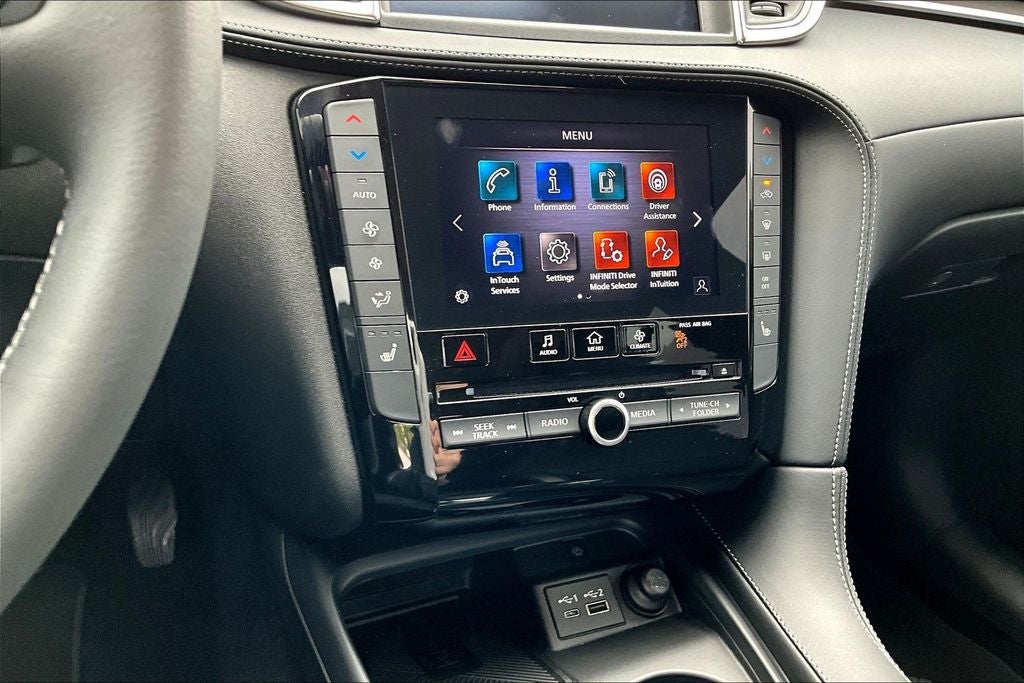 - Radio: HD Audio System -inc: 6 speakers, INFINITI InTouch, INFINITI InTouch services, INFINITI InTouch dual display system w/upper 8" and lower 7" HD touch screens, wireless Apple CarPlay, Android Auto, HD Radio technology, SiriusXM radio w/advanced audio features and 90-day complimentary trial, SiriusXM Travel Link w/90-day complimentary trial, INFINITI voice recognition, Siri Eyes Free, Wi-Fi hotspot, active noise cancellation, Bluetooth® hands-free phone system and streaming audio via Bluetooth®