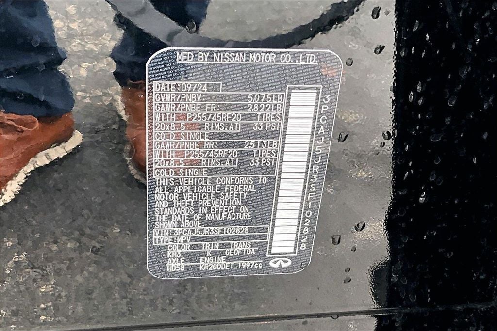 Grubbs INFINITI of San Antonio is pleased to present you with another Market Priced Pre-Owned Vehicle that has gone through our comprehensive 167 point safety inspection. This 2025 INFINITI QX55 LUXE is loaded with the following high value options Accent Package (Matte Chrome Bodyside Molding and Matte Chrome Mirror Caps), Cargo Package (Black Film Rear Bumper Protector, Cargo Net, and Reversible Cargo Mat), INFINITI Certified, 4-Wheel Disc Brakes, 6 Speakers, ABS brakes, Air Conditioning, Alloy wheels, AM/FM radio: SiriusXM, Auto High-beam Headlights, Auto-dimming Rear-View mirror, Automatic temperature control, Black Splash Guards (Set of 4), Brake assist, Bumpers: body-color, Carpeted Floor Mats, CD player, Delay-off headlights, Driver door bin, Driver vanity mirror, Dual front impact airbags, Dual front side impact airbags, Electronic Stability Control, Emergency communication system: INFINITI InTouch, Exterior Parking Camera Rear, Four wheel independent suspension, Front anti-roll bar, Front Bucket Seats, Front Center Armrest, Front dual zone A/C, Front fog lights, Front reading lights, Fully automatic headlights, Garage door transmitter, Heated door mirrors, Heated Front Bucket Seats, Heated front seats, Illuminated entry, Knee airbag, Leather Shift Knob, Leather steering wheel, Leather-Appointed Seat Trim, Literature Kit, Low tire pressure warning, Memory seat, Occupant sensing airbag, Outside temperature display, Overhead airbag, Overhead console, Panic alarm, Passenger door bin, Passenger vanity mirror, Power door mirrors, Power driver seat, Power Liftgate, Power moonroof, Power passenger seat, Power steering, Power windows, Radio data system, Radio: AM/FM Audio System, Rear anti-roll bar, Rear Parking Sensors, Rear reading lights, Rear seat center armrest, Rear side impact airbag, Rear window defroster, Rear window wiper, Remote keyless entry, Security system, Speed control, Speed-sensing steering, Speed-Sensitive Wipers, Split folding rear seat, Spoiler, Steering wheel mounted audio controls, Tachometer, Telescoping steering wheel, Tilt steering wheel, Traction control, Trip computer, Turn signal indicator mirrors, Variably intermittent wipers, and Wheels: 8.5J x 20 Machine Finished Aluminum Alloy. Clean CARFAX. Priced below KBB Fair Purchase Price!