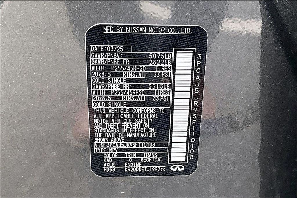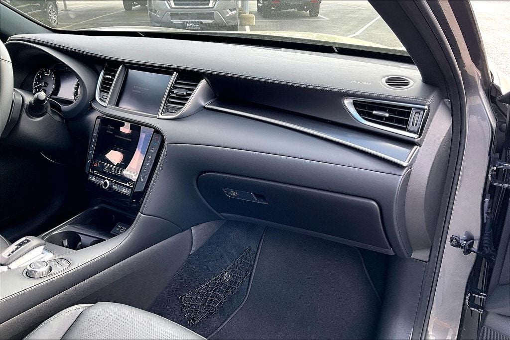 Grubbs INFINITI of San Antonio is pleased to present you with another Market Priced Pre-Owned Vehicle that has gone through our comprehensive 167 point safety inspection. This 2025 INFINITI QX55 LUXE is loaded with the following high value options Cargo Package (Black Film Rear Bumper Protector, Cargo Net, and Reversible Cargo Mat), INFINITI Certified Certified, 4-Wheel Disc Brakes, 6 Speakers, ABS brakes, Air Conditioning, Alloy wheels, AM/FM radio: SiriusXM, Auto High-beam Headlights, Auto-dimming Rear-View mirror, Automatic temperature control, Black Splash Guards (Set of 4), Brake assist, Bumpers: body-color, Carpeted Floor Mats, CD player, Delay-off headlights, Driver door bin, Driver vanity mirror, Dual front impact airbags, Dual front side impact airbags, Electronic Stability Control, Emergency communication system: INFINITI InTouch, Exterior Parking Camera Rear, Four wheel independent suspension, Front anti-roll bar, Front Bucket Seats, Front Center Armrest, Front dual zone A/C, Front fog lights, Front reading lights, Fully automatic headlights, Garage door transmitter, Heated door mirrors, Heated Front Bucket Seats, Heated front seats, Illuminated entry, Knee airbag, Leather Shift Knob, Leather steering wheel, Leather-Appointed Seat Trim, Literature Kit, Low tire pressure warning, Memory seat, Occupant sensing airbag, Outside temperature display, Overhead airbag, Overhead console, Panic alarm, Passenger door bin, Passenger vanity mirror, Power door mirrors, Power driver seat, Power Liftgate, Power moonroof, Power passenger seat, Power steering, Power windows, Radio data system, Radio: AM/FM Audio System, Rear anti-roll bar, Rear Parking Sensors, Rear reading lights, Rear seat center armrest, Rear side impact airbag, Rear window defroster, Rear window wiper, Remote keyless entry, Security system, Speed control, Speed-sensing steering, Speed-Sensitive Wipers, Split folding rear seat, Spoiler, Steering wheel mounted audio controls, Tachometer, Telescoping steering wheel, Tilt steering wheel, Traction control, Trip computer, Turn signal indicator mirrors, Variably intermittent wipers, and Wheels: 8.5J x 20 Machine Finished Aluminum Alloy. Clean CARFAX. Priced below KBB Fair Purchase Price!