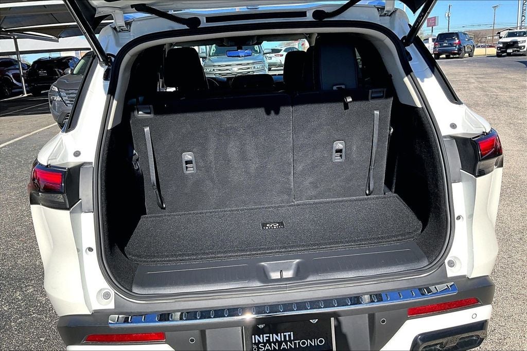 Grubbs INFINITI of San Antonio is pleased to present you with another Market Priced Pre-Owned Vehicle that has gone through our comprehensive 167 point safety inspection. This 2025 INFINITI QX60 LUXE is loaded with the following high value options Cargo Package (Cargo Mat (Reversible), Cargo Net, and First Aid Kit), Vision Package (10.8 Head-Up Display, Adaptive Front Lighting System, and Smart Rear View Mirror), INFINITI Certified Certified, 17 Speakers, 3rd row seats: bench, 4-Wheel Disc Brakes, ABS brakes, Air Conditioning, Alloy wheels, AM/FM radio: SiriusXM, Anti-whiplash front head restraints, Apple CarPlay/Android Auto, Auto High-beam Headlights, Auto tilt-away steering wheel, Auto-dimming door mirrors, Auto-dimming Rear-View mirror, Automatic temperature control, Bose Performance Series 17-Speaker Sound System, Brake assist, Bumpers: body-color, Climate Controlled Front Bucket Seats, Delay-off headlights, Driver door bin, Driver vanity mirror, Dual front impact airbags, Dual front side impact airbags, Electronic Stability Control, Emergency communication system: INFINITI InTouch, Exterior Parking Camera Rear, Floor Mats w/Bench Seats on 3rd Row Tray, Four wheel independent suspension, Front anti-roll bar, Front Bucket Seats, Front Center Armrest, Front dual zone A/C, Front reading lights, Fully automatic headlights, Garage door transmitter: HomeLink, Heated door mirrors, Heated front seats, Heated rear seats, Heated steering wheel, Illuminated entry, Knee airbag, Leather Shift Knob, Leather steering wheel, Leather-Appointed Seating Surfaces, Literature Kit, Low tire pressure warning, Memory seat, Navigation system: INFINITI InTouch Navigation, Occupant sensing airbag, Outside temperature display, Overhead airbag, Overhead console, Panic alarm, Passenger door bin, Passenger vanity mirror, Power door mirrors, Power driver seat, Power Liftgate, Power moonroof, Power passenger seat, Power steering, Power windows, Premium Paint, Radio data system, Radio: Bose Performance Series, Rain sensing wipers, Rear air conditioning, Rear anti-roll bar, Rear reading lights, Rear seat center armrest, Rear side impact airbag, Rear window defroster, Rear window wiper, Reclining 3rd row seat, Remote keyless entry, Security system, Speed control, Speed-sensing steering, Speed-Sensitive Wipers, Splash Guards, Split folding rear seat, Spoiler, Steering wheel memory, Steering wheel mounted audio controls, Tachometer, Telescoping steering wheel, Tilt steering wheel, Traction control, Trip computer, Turn signal indicator mirrors, Variably intermittent wipers, Ventilated front seats, and Wheels: 20 x 8J Sporty Machined Aluminum Alloy. Clean CARFAX. Priced below KBB Fair Purchase Price!