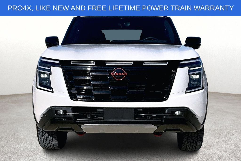 Grubbs INFINITI offers this Market Priced Pre-Owned 2025 Nissan Armada PRO-4X in Aspen White Tricoat with a premium Charcoal interior. Fully inspected and all Eligible Vehicles are backed by our exclusive Grubbs Lifetime Powertrain Warranty, it comes loaded with features including 4WD, Auto-leveling suspension, Automatic temperature control, Fully automatic headlights, Memory seat, Navigation System, Power Liftgate, PRO-4X Mud Guards, PRO-4X Unique Quilted Leather Seat Trim, Radio: NissanConnect w/SiriusXM 360L, Rain sensing wipers, Security system, and Wheels: 20 Painted PRO-4X Alloy 4WD, Auto-leveling suspension, Automatic temperature control, Fully automatic headlights, Memory seat, Navigation System, Power Liftgate, PRO-4X Mud Guards, PRO-4X Unique Quilted Leather Seat Trim, Radio: NissanConnect w/SiriusXM 360L, Rain sensing wipers, Security system, Wheels: 20 Painted PRO-4X Alloy, 12 Speakers, 3rd row seats: split-bench, 4-Wheel Disc Brakes, ABS brakes, Adaptive suspension, Air Conditioning, Alloy wheels, AM/FM radio: SiriusXM, Anti-whiplash front head restraints, Auto High-beam Headlights, Auto tilt-away steering wheel, Auto-dimming door mirrors, Auto-dimming Rear-View mirror, Brake assist, Bumpers: body-color, Delay-off headlights, Driver door bin, Driver vanity mirror, Dual front impact airbags, Dual front side impact airbags, Electronic Stability Control, Emergency communication system: NissanConnect Services, Fog lights, Four wheel independent suspension, Front anti-roll bar, Front Bucket Seats, Front Center Armrest, Front dual zone A/C, Front reading lights, Front Tow Hooks, Garage door transmitter: myQ Connected Garage, Genuine wood dashboard insert, Heated door mirrors, Heated Front Bucket Seats, Heated front seats, Heated steering wheel, HVAC memory, Illuminated entry, Knee airbag, Leather steering wheel, Low tire pressure warning, Occupant sensing airbag, Outside temperature display, Overhead airbag, Overhead console, Panic alarm, Passenger door bin, Passenger vanity mirror, Power door mirrors, Power driver seat, Power passenger seat, Power steering, Power windows, Premium Paint, PRO-4X Carpeted Floor Mats, Rear air conditioning, Rear anti-roll bar, Rear reading lights, Rear seat center armrest, Rear window defroster, Rear window wiper, Reclining 3rd row seat, Remote keyless entry, Roof Rail Cross Bars, Speed control, Speed-sensing steering, Speed-Sensitive Wipers, Split folding rear seat, Spoiler, Steering wheel memory, Steering wheel mounted audio controls, Tachometer, Telescoping steering wheel, Tilt steering wheel, Traction control, Trip computer, Turn signal indicator mirrors, Variably intermittent wipers, and Voltmeter. 4WD, Auto-leveling suspension, Automatic temperature control, Fully automatic headlights, Memory seat, Navigation System, Power Liftgate, PRO-4X Mud Guards, PRO-4X Unique Quilted Leather Seat Trim, Radio: NissanConnect w/SiriusXM 360L, Rain sensing wipers, Security system, Wheels: 20 Painted PRO-4X Alloy.